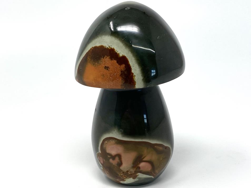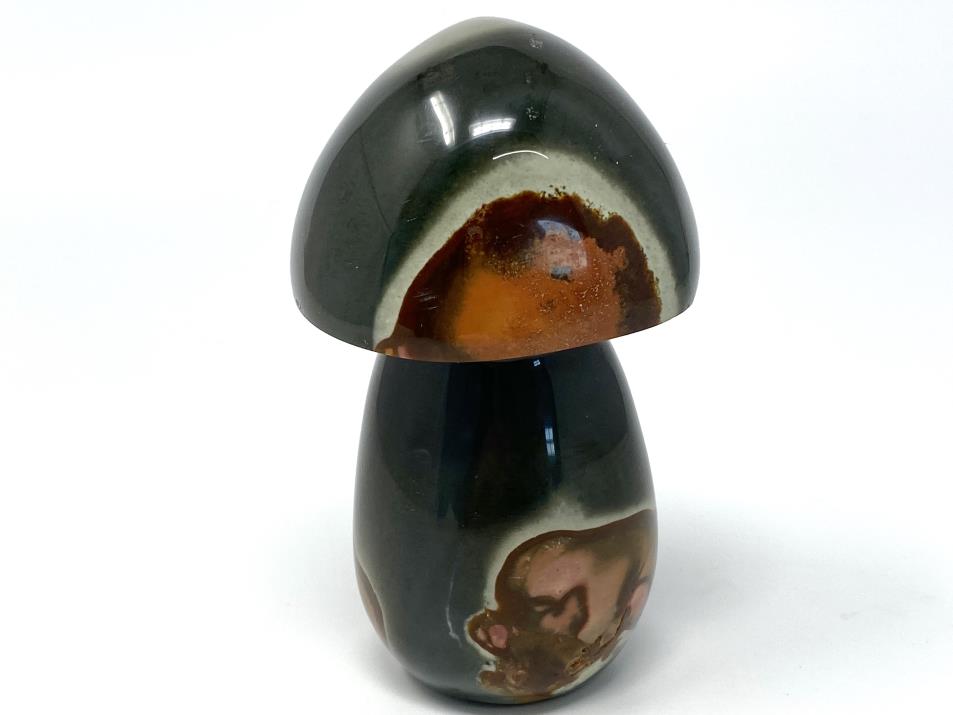 This striking Polychrome Jasper Mushroom Crystal Carving showcases stunning swirls and circular patterns, and this polished crystal carving displays a unique mushroom/toadstool shape and free-standing base.