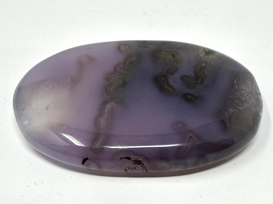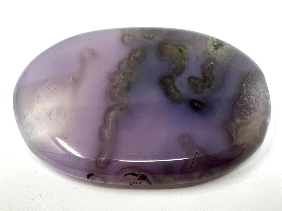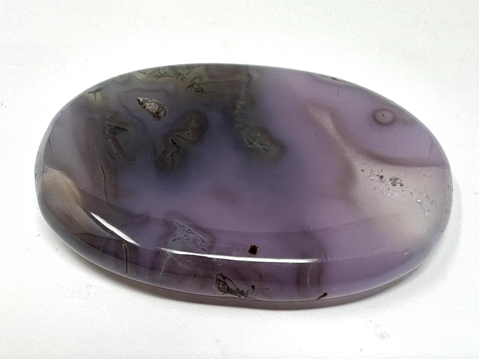 This stunning Purple Moss Agate Pebble, when lying flat on a surface, displays a deep grape-purple hue, whilst when held up to the light, it displays a lovely subtle, lilac-grey translucency.