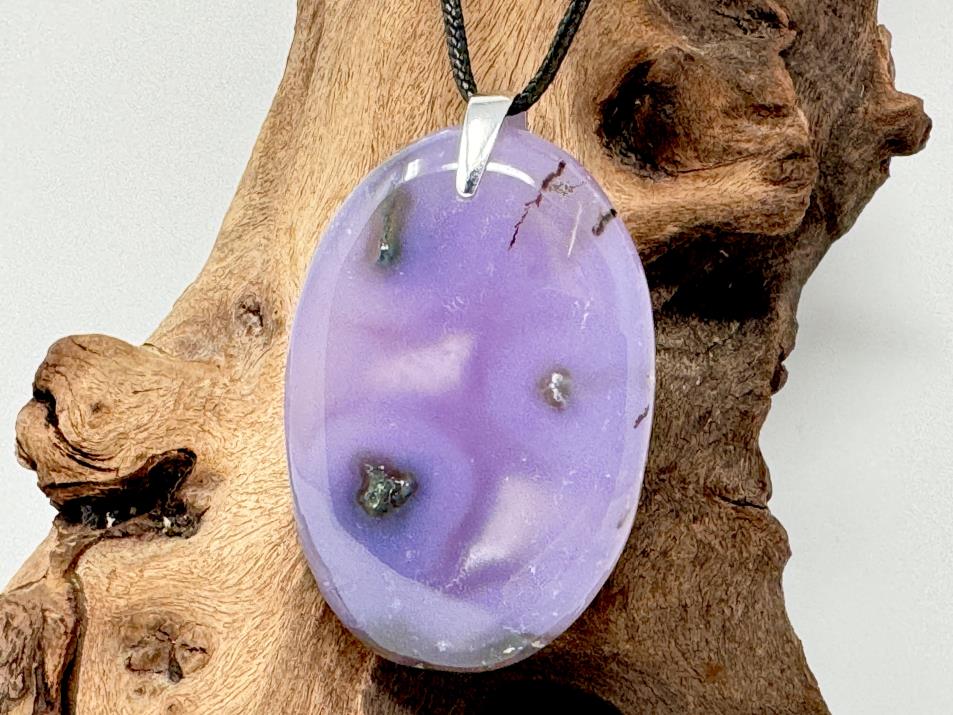 This stunning Large Purple Moss Agate Crystal Pendant, when lying flat on a surface, displays a deep grape-purple hue, and when held up to the light, it displays a lovely subtle, lilac-grey translucency.