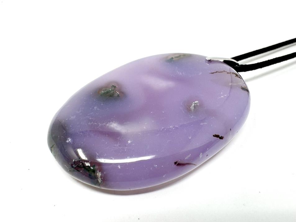 Purple Moss Agate Crystals display the same green moss-like dendritic patterns so revered in typical Moss Agate (Tree Agate) but instead of tree-like white and green colouring, this Purple Moss Agate Pendant stuns with translucent Purple Chalcedony, which ranges in hue from lilacs and lavenders to hints of deep indigo.