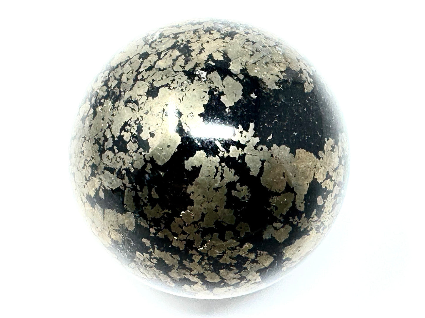 This stunning Pyrite Crystal Sphere (otherwise known as a Pyrite Sphere or Pyrite Crystal Ball) measures 5.1cm in diameter, and shimmers and shines with gorgeous golden hues which reflect like a mirror and contrast strikingly against clouds of jet-black, creating a marvellous tapestry of colour.