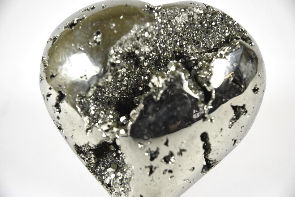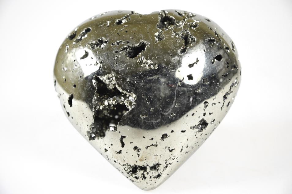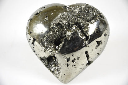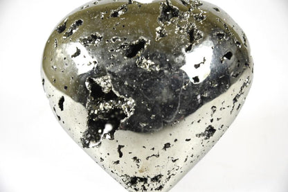 This unique polished Large Pyrite Crystal Heart is a stunning specimen of Fool's Gold with gorgeous, sparkling natural crystal cavities.