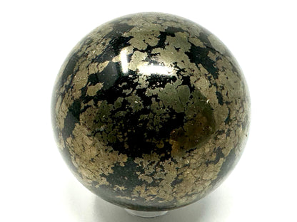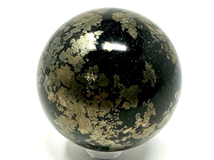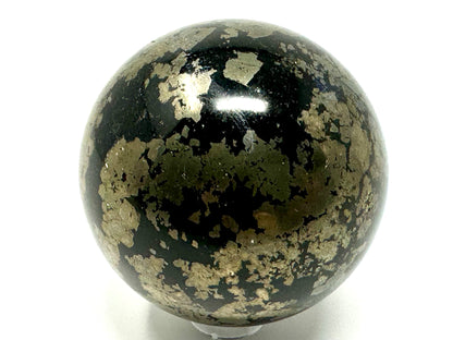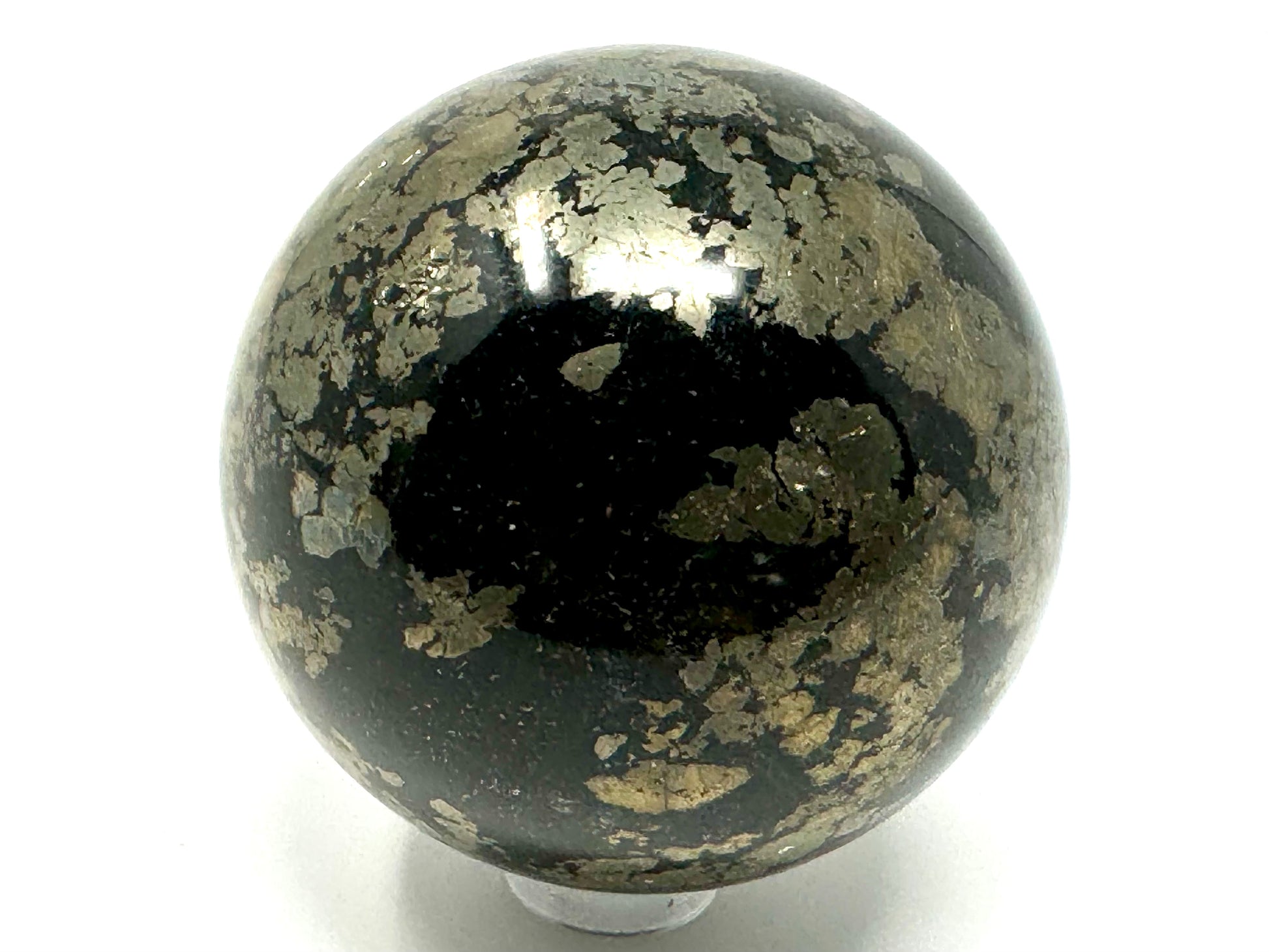This stunning Pyrite Crystal Sphere (otherwise known as a Pyrite Sphere or Pyrite Crystal Ball) measures 5.7cm in diameter, and shimmers and shines with gorgeous golden hues which reflect like a mirror and contrast strikingly against clouds of jet-black, creating a marvellous tapestry of colour.