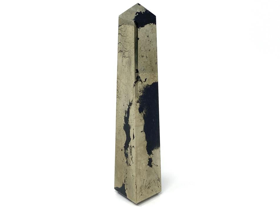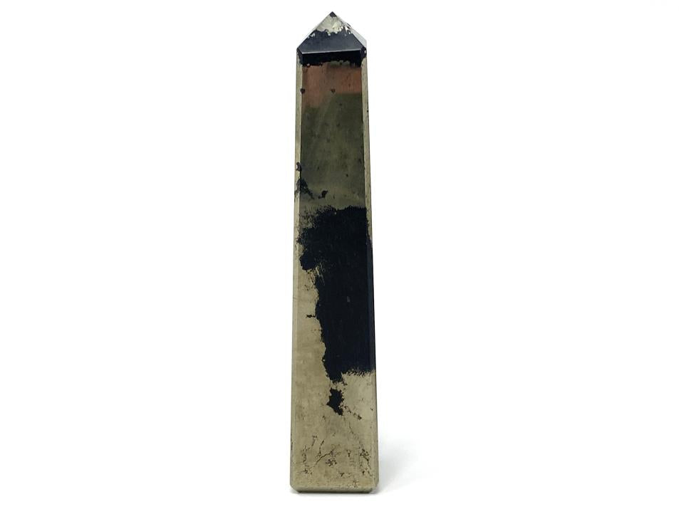 The Polished Iron Pyrite Stone has been carefully cut into a smooth crystal tower shape (crystal obelisk shape) with a free-standing square base, four polished faces, and sharp pointed tip.
