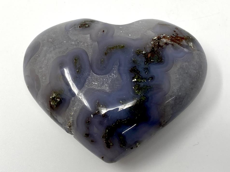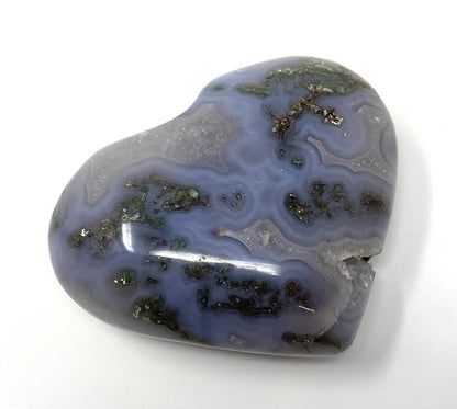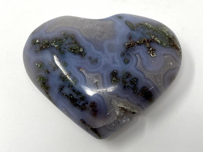 This beautiful Quartz Agate Crystal Heart measuring 7.2cm wide displays a stunning Quartz base adorned with beautiful circles and tube-like banded patterns of translucent Blue-Grey Chalcedony Agate.