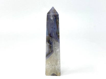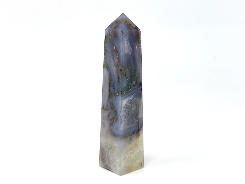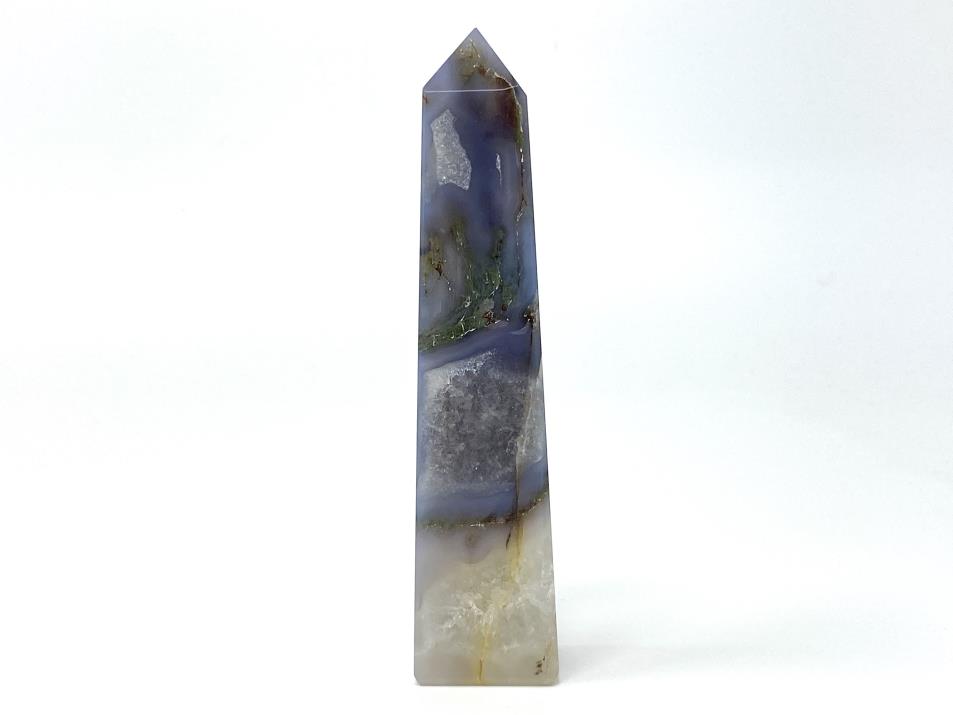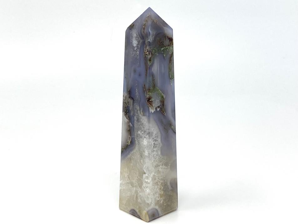This beautiful Quartz Agate Crystal Tower (or Quartz Agate Crystal Obelisk) measuring 12.6cm tall displays a stunning Quartz base adorned with beautiful circles and tube-like banded patterns of translucent Blue-Grey Chalcedony Agate.