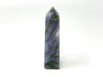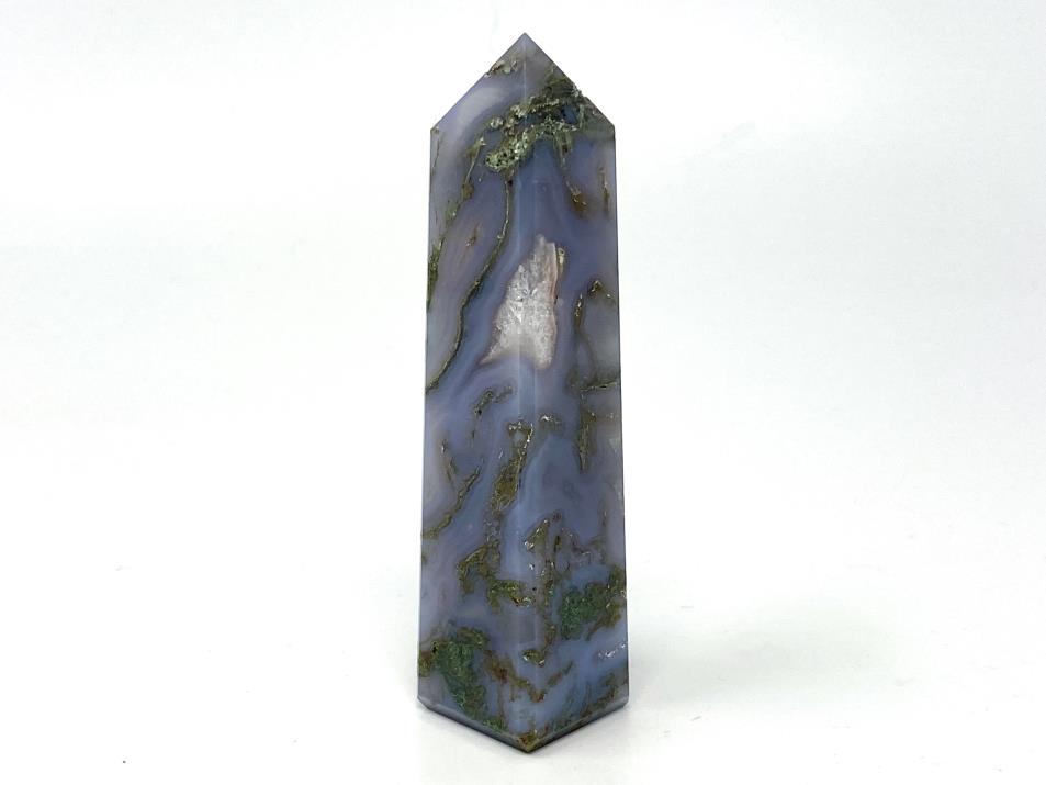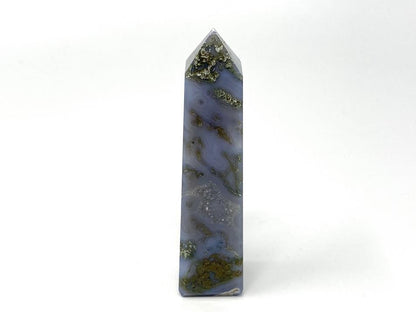 This beautiful Quartz Agate Crystal Tower (or Quartz Agate Crystal Obelisk) measuring 10.9cm tall displays a stunning Quartz base adorned with beautiful circles and tube-like banded patterns of translucent Blue-Grey Chalcedony Agate.