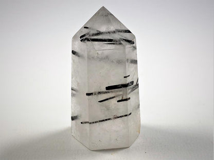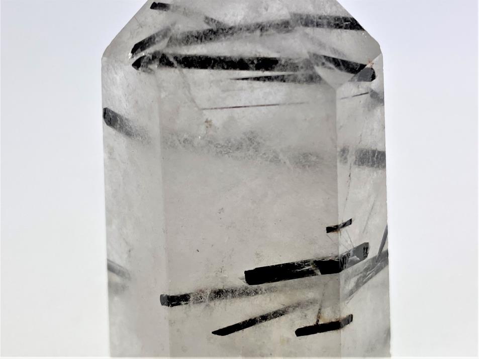 When the Quartz crystal was growing, or even before growth, minerals (in this case, Black Tourmaline) grew to be surrounded by the Clear Quartz. These minerals, which are sometimes too delicate to survive unprotected, were consequently protected by the Quartz. The clarity of the Quartz crystal provides a window through which to view the Black Tourmaline inclusions that it protects.