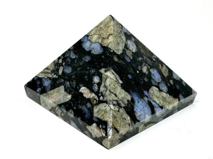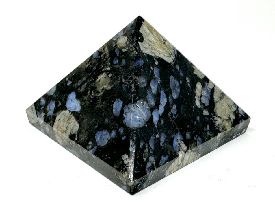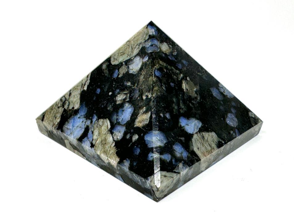 The Polished Que Sera Stone has been cut into a smooth, tactile, polished crystal pyramid shape with a free-standing square base, polished faces, and sharp pointed tip.