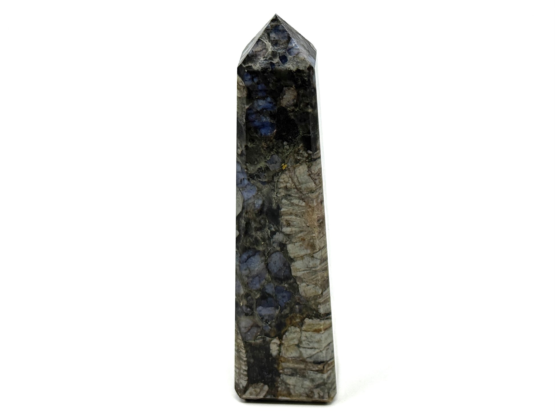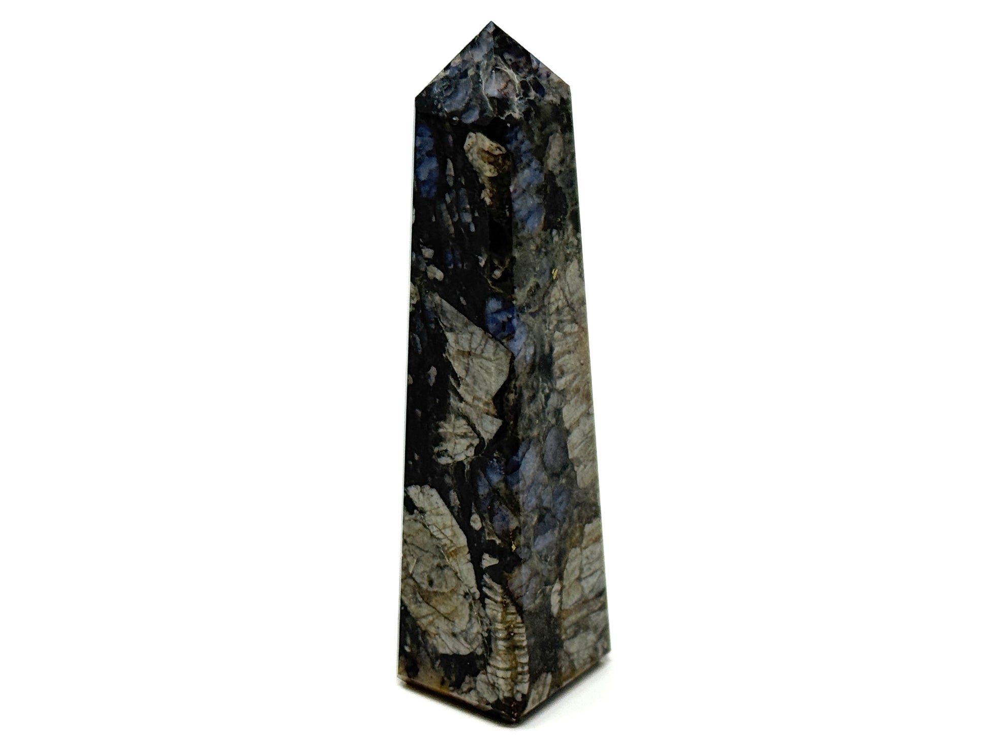 The Polished Que Sera Stone has been cut into a smooth, tactile, polished crystal tower shape (crystal obelisk shape) with a free-standing square base, four polished faces, and a sharp pointed tip.