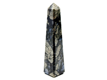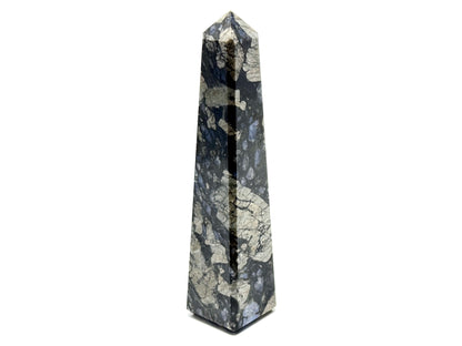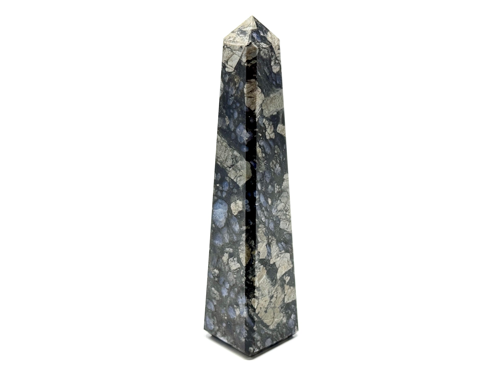 The Polished Que Sera Stone has been cut into a smooth, tactile, polished crystal tower shape (crystal obelisk shape) with a free-standing square base, four polished faces, and a sharp pointed tip.