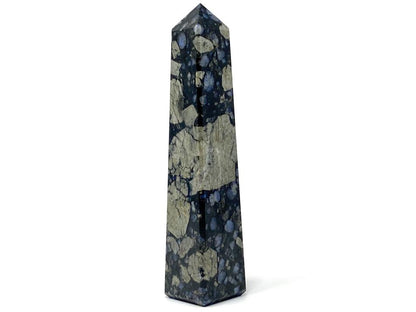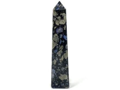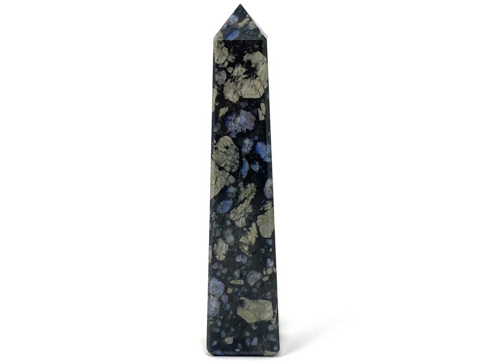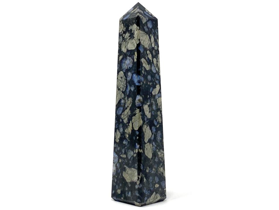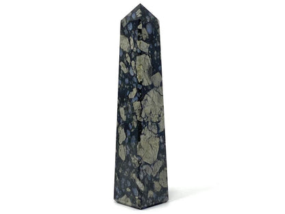 The Polished Que Sera Stone has been cut into a smooth, tactile, polished crystal tower shape (crystal obelisk shape) with a free-standing square base, four polished faces, and a sharp pointed tip.
