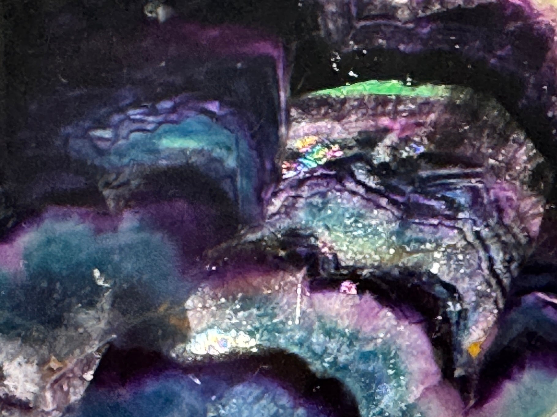 Rainbow Fluorite, overall, cleanses negative energies from one's aura, calms your strong emotions, and helps you to speak from your heart and live in harmony with yourself and others.