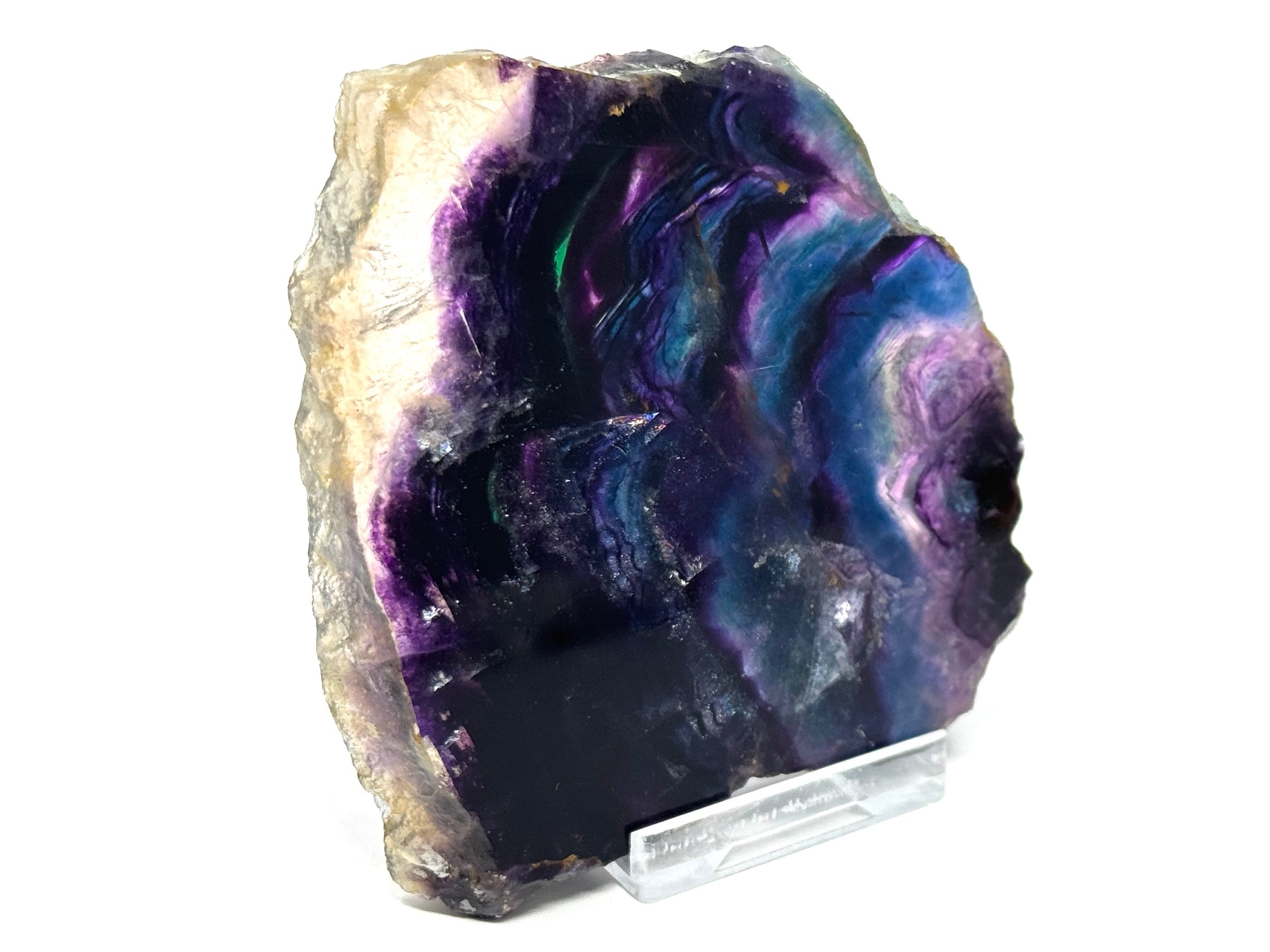 This vibrant, colourful 8.7cm long Rainbow Fluorite Slice showcases a spectacular spectrum of colour.
