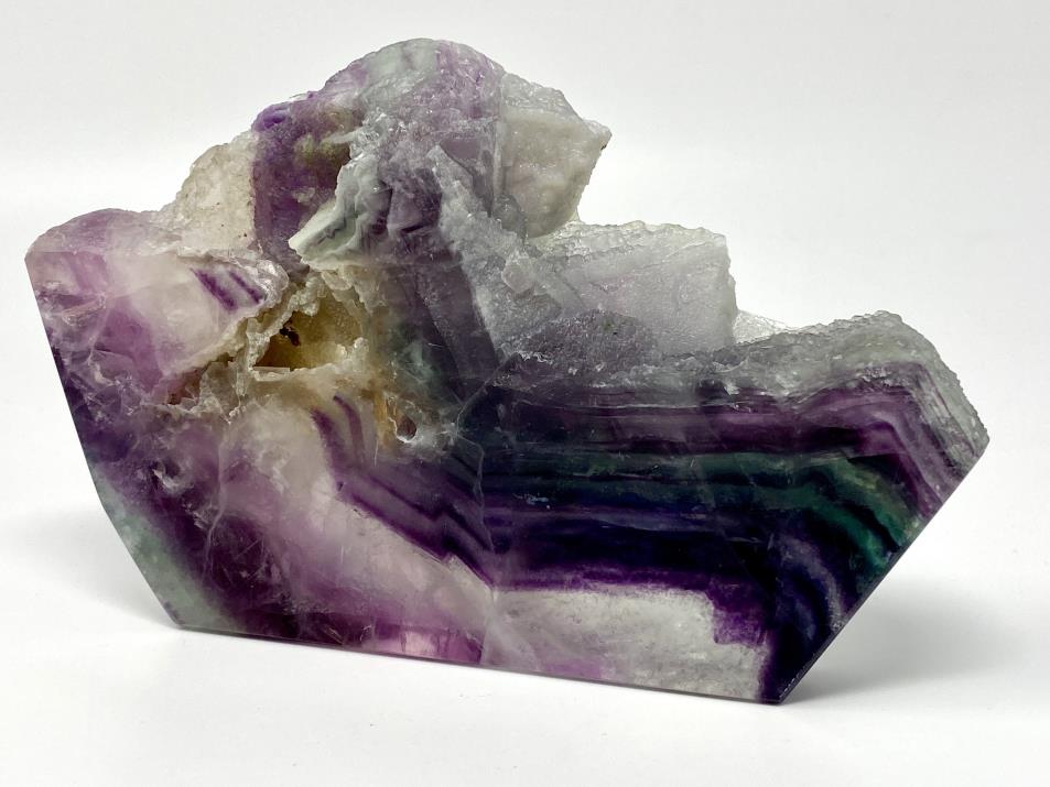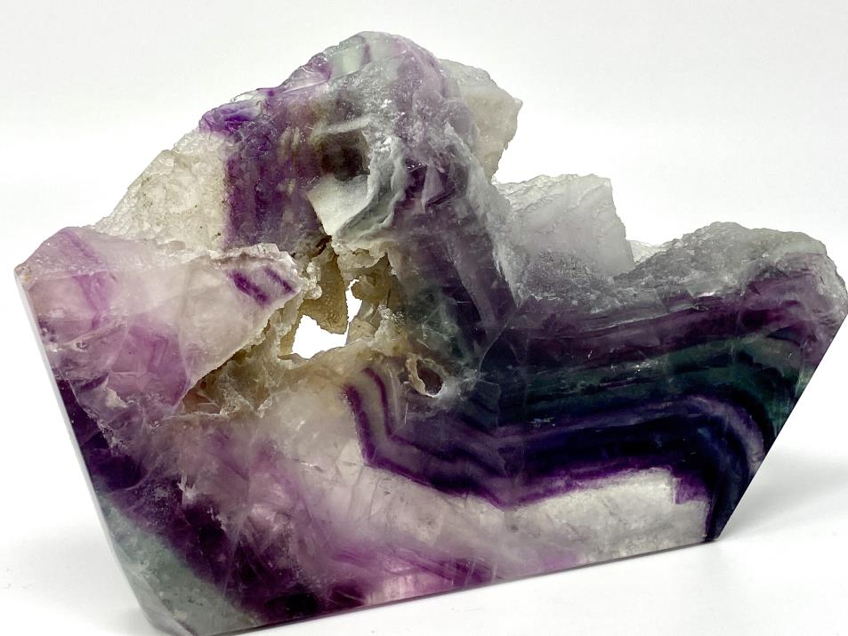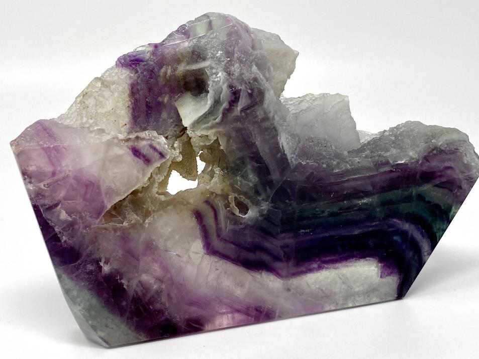 The Fluorite is of a very high grade, displaying shimmering bands of vivid purples amidst stripes of striking blues and greens, which complement each-other to create a radiant effect.