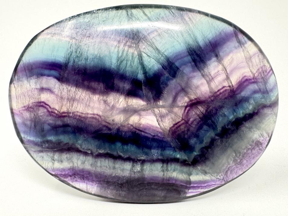 The Fluorite is of a very high grade, displaying shimmering bands of vivid purples, deep sea-blues, and light aqua-blues amidst stripes of turquoise-green, which complement each-other to create a radiant effect.