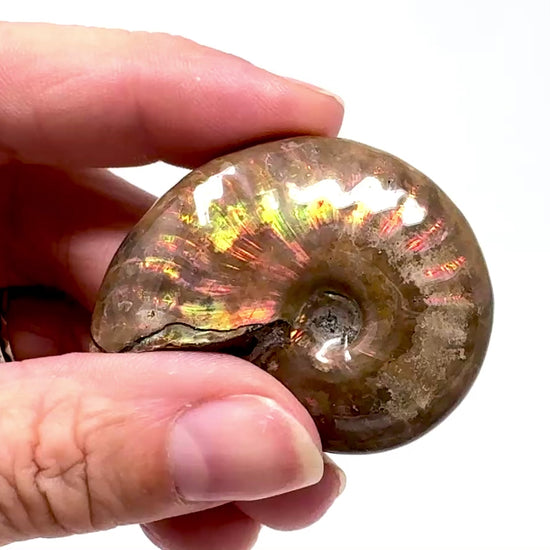 As you move an iridescent ammonite in the presence of light, one can observe the colours moving, changing, and flashing in what is known as chromatic shift.