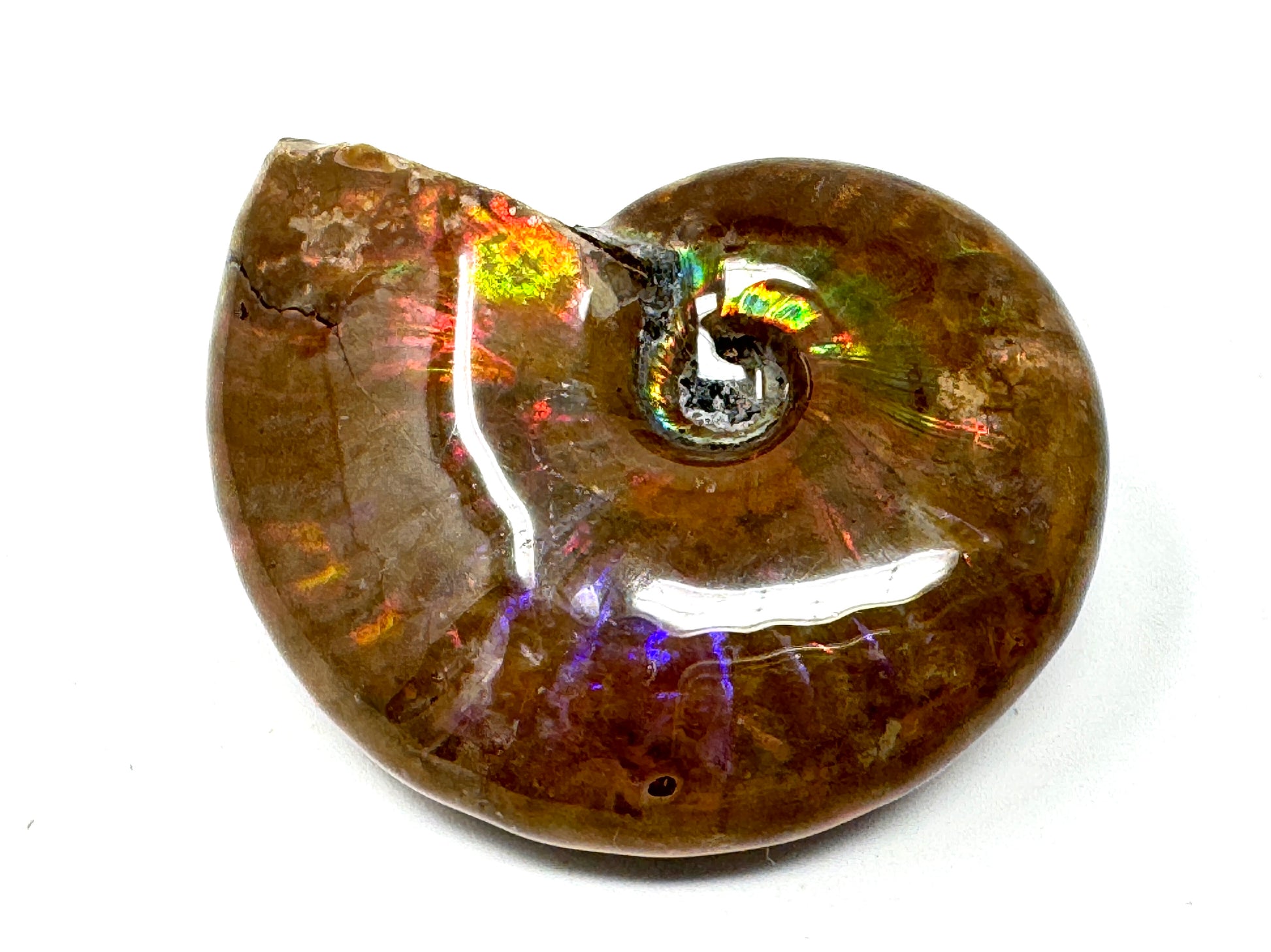 The spectrum of this Opalescent Ammonite's rainbow iridescent flash includes flashes of shimmering yellow-gold, emerald green, electric blue, and fiery red: this Rainbow Ammonite displays an even wider variety of colour than the already vivacious Red Iridescent Ammonite.