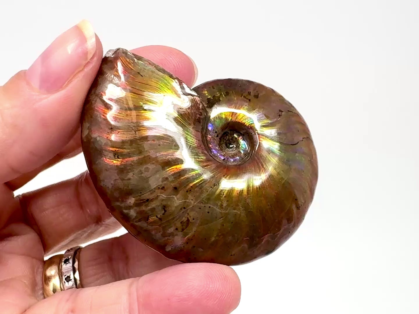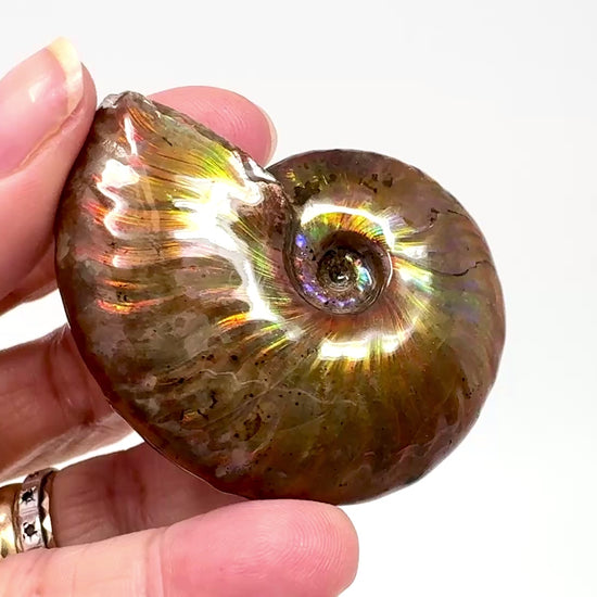 As you move an iridescent ammonite in the presence of light, one can observe the colours moving, changing, and flashing in what is known as chromatic shift.