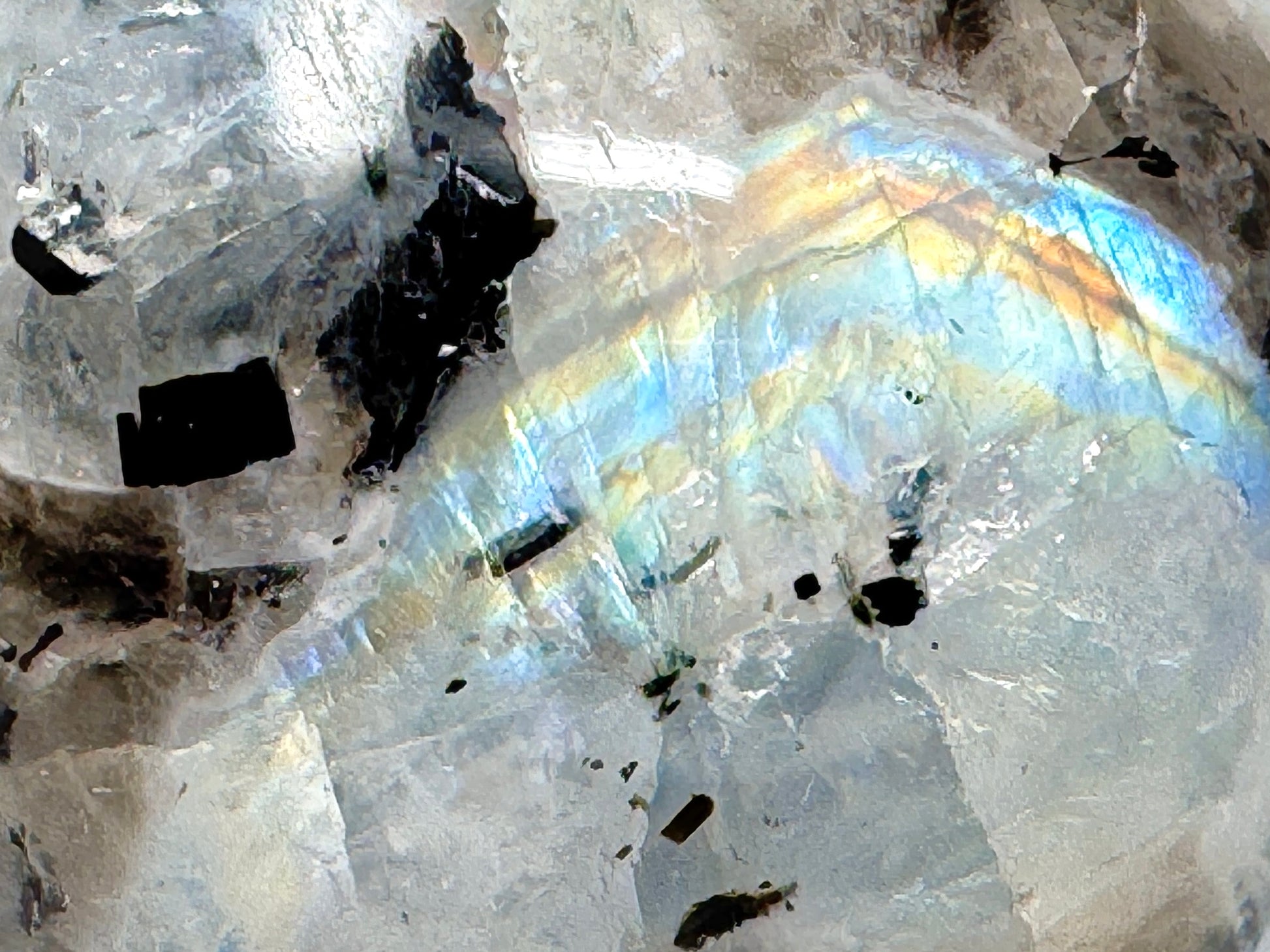 The inner glow of Rainbow Moonstone is caused by the refraction of light between layered minerals: this is the same mechanism that leads to the iridescent Schiller Effect in Labradorite.