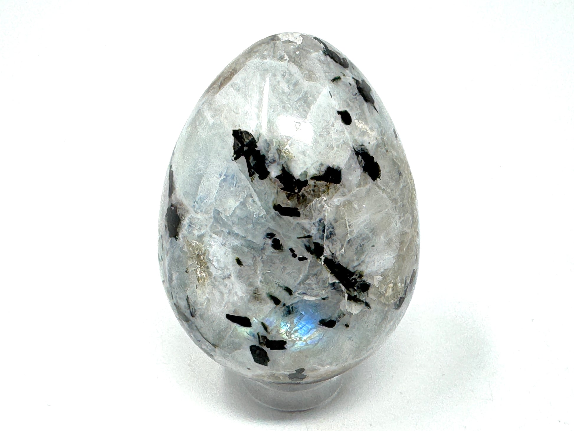 This gorgeous Rainbow Moonstone Crystal Egg (otherwise known as a Rainbow Moonstone Egg Crystal) measuring 5cm tall displays a creamy white translucence and flashes of glowing bright blue.