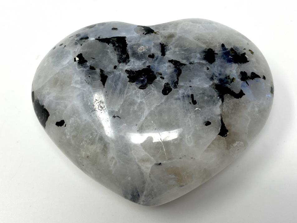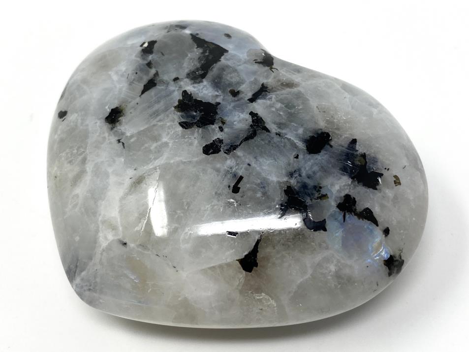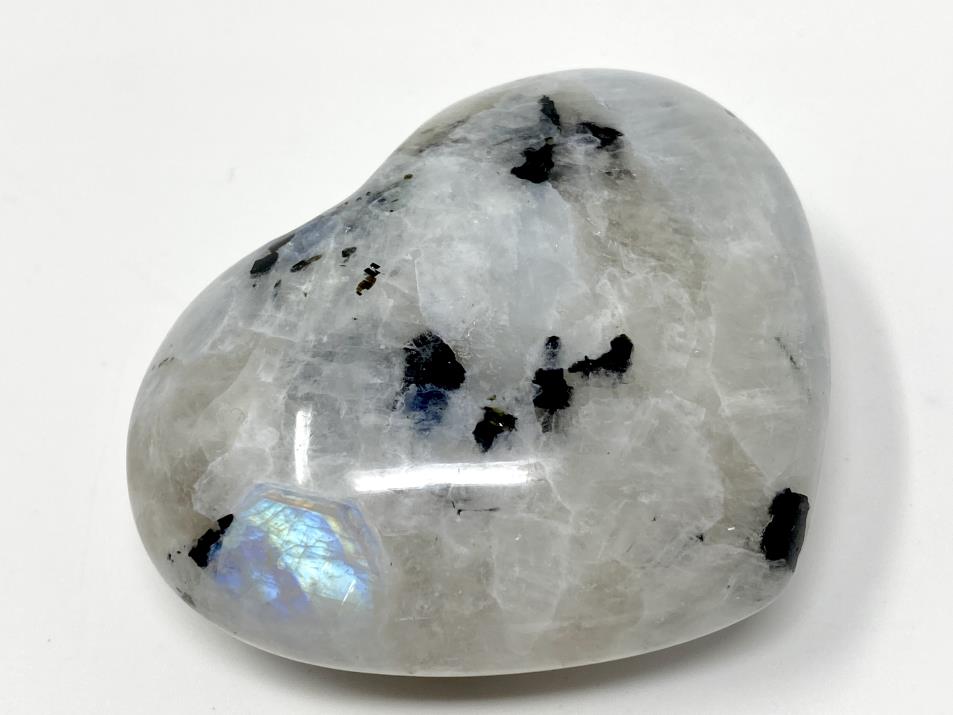 This gorgeous Rainbow Moonstone Crystal Heart (otherwise known as a Rainbow Moonstone Heart Crystal) measuring 7cm wide displays a creamy white translucence and flashes of glowing bright blue.