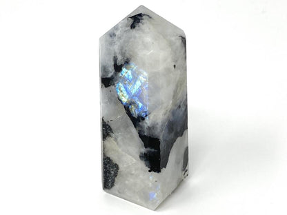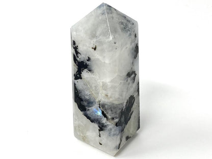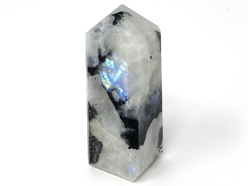 This gorgeous Rainbow Moonstone Crystal Tower (otherwise known as a Rainbow Moonstone Tower Crystal or Obelisk Crystal/ Crystal Obelisk) measuring 6.5cm tall displays a creamy white translucence and flashes of glowing bright blue.