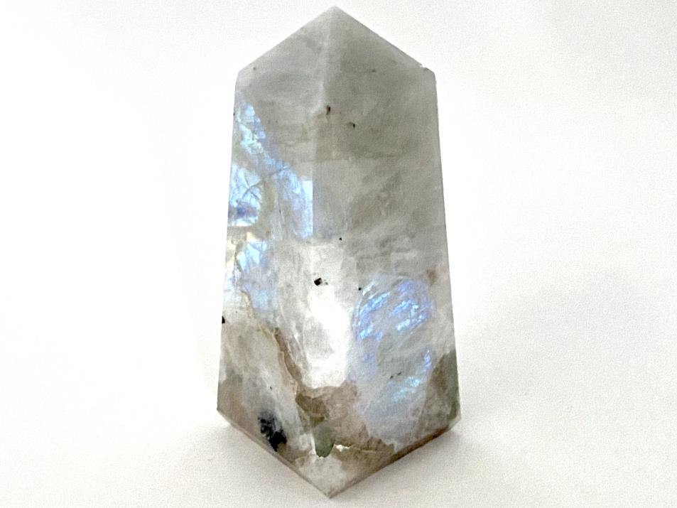 This gorgeous Rainbow Moonstone Crystal Tower (otherwise known as a Rainbow Moonstone Tower Crystal or Obelisk Crystal/ Crystal Obelisk) measuring 8.5cm tall displays a creamy white translucence and flashes of glowing bright blue.