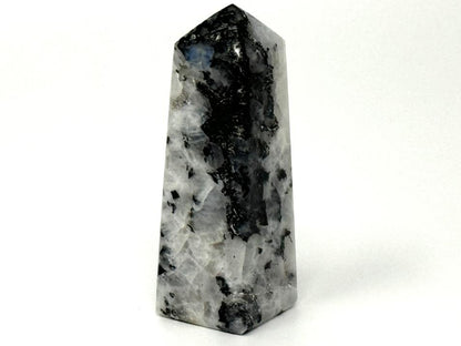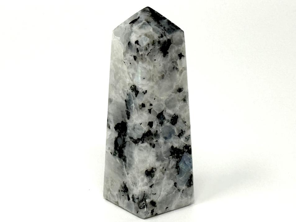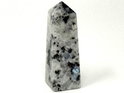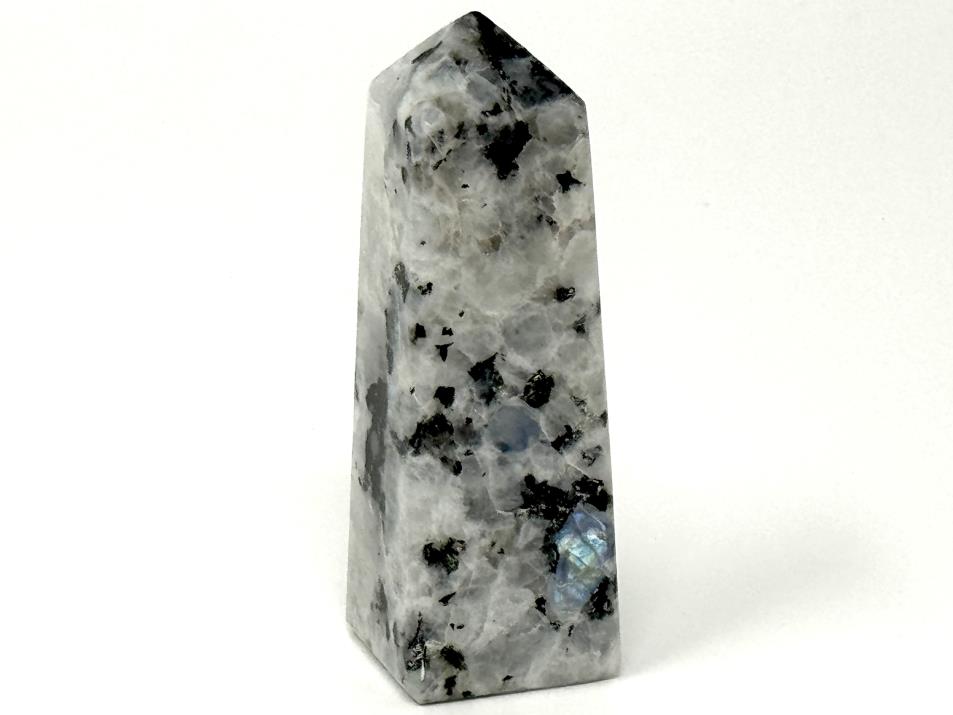 This gorgeous Rainbow Moonstone Crystal Tower (otherwise known as a Rainbow Moonstone Tower Crystal or Obelisk Crystal/ Crystal Obelisk) measuring 8.1cm tall displays a creamy white translucence and flashes of glowing bright blue.