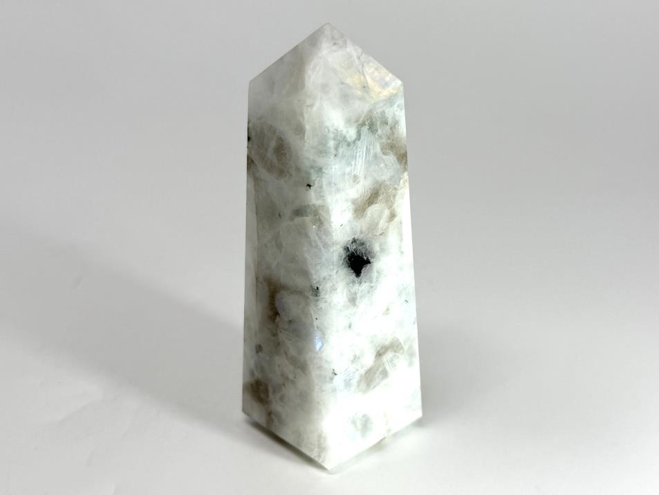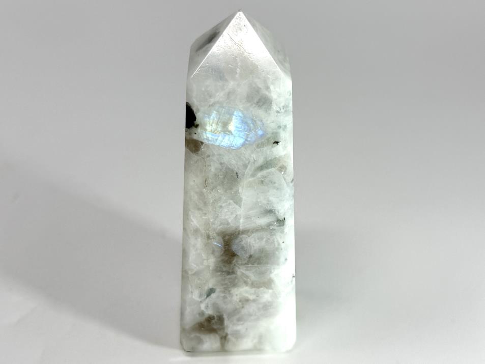 This gorgeous Rainbow Moonstone Crystal Tower (otherwise known as a Rainbow Moonstone Tower Crystal or Obelisk Crystal/ Crystal Obelisk) measuring 9.2cm tall displays a creamy white translucence and flashes of glowing bright blue.