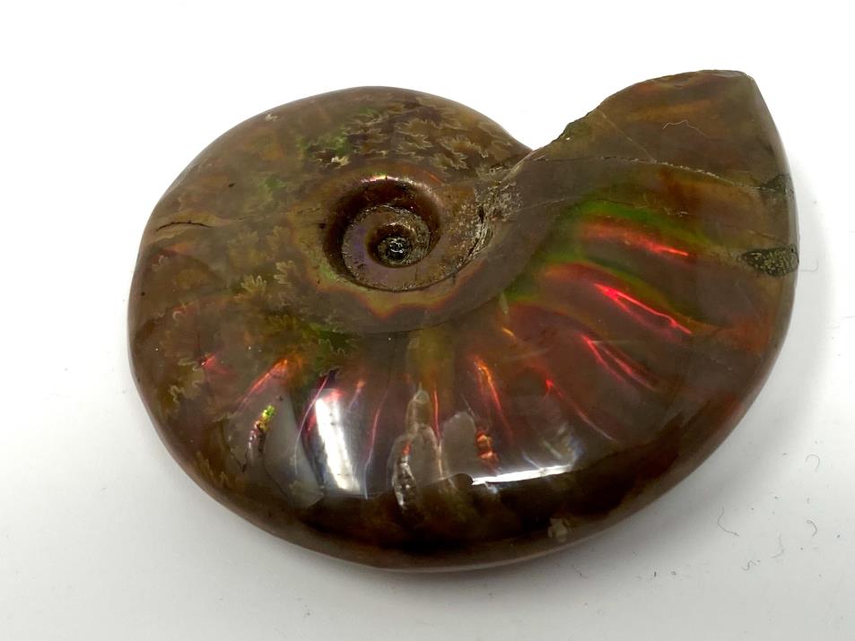 Thick layers of Aragonite typically leads to shades of red being observed, such as in this red iridescent ammonite, whilst thinner layers lead to shimmering greens, which can also sometimes be observed in red iridescent ammonites.