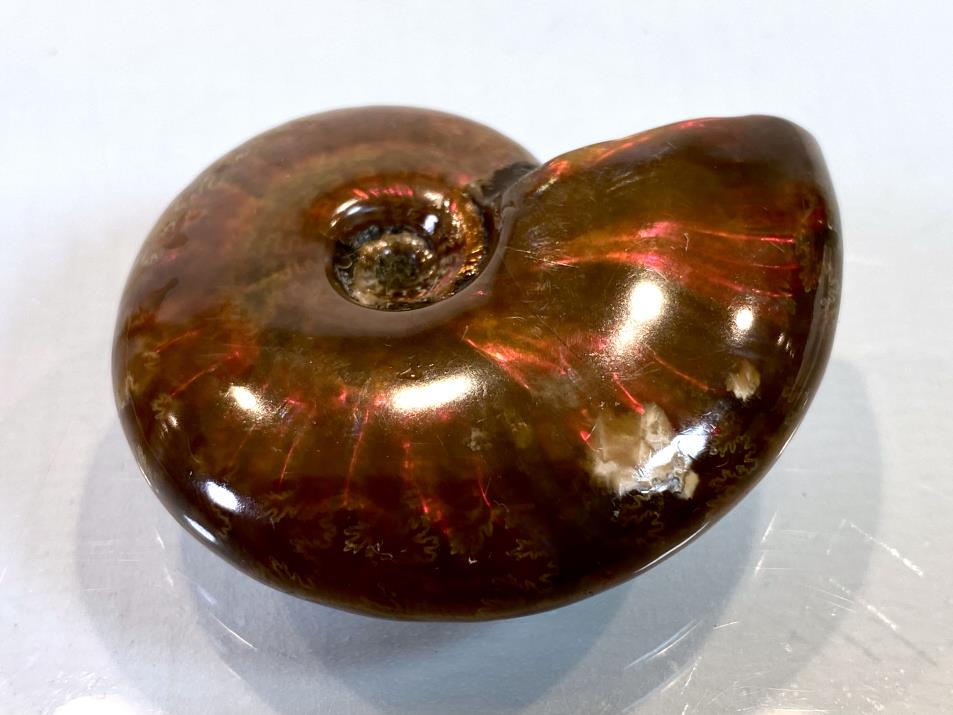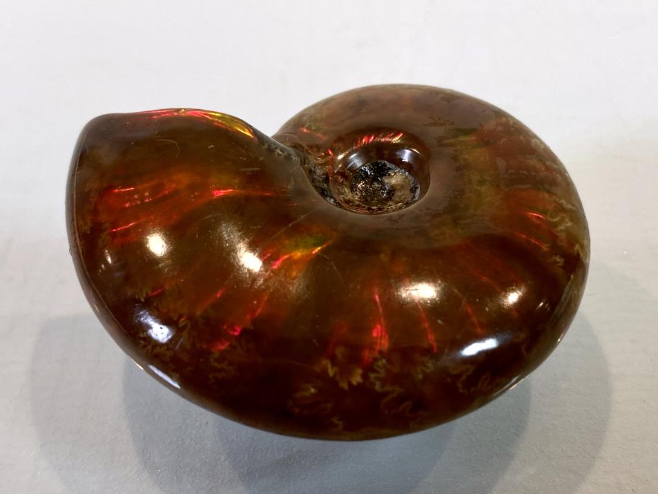 Gem ammonites such as this red iridescent ammonite are called biogenic gemstones (the only other gems of this type are pearl and amber) because they are formed from the fossilised organic material of once living creatures.