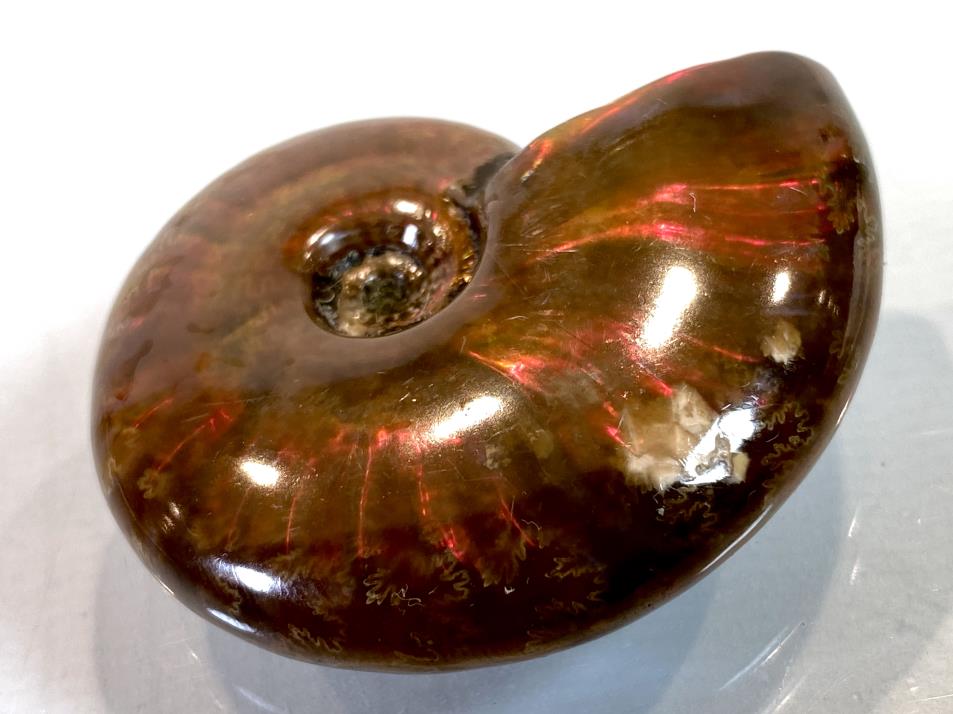 Due to their fiery hues, these red iridescent ammonites are often referred to as fire ammonites, although they are also sometimes called opalescent ammonites in reference to their opal-like appearance.