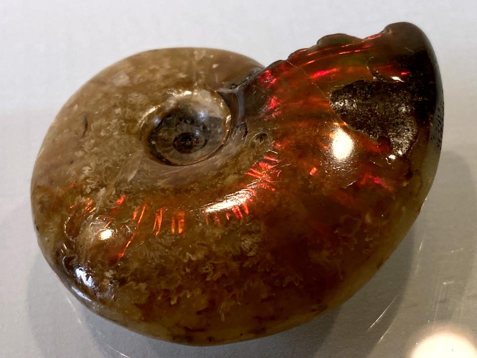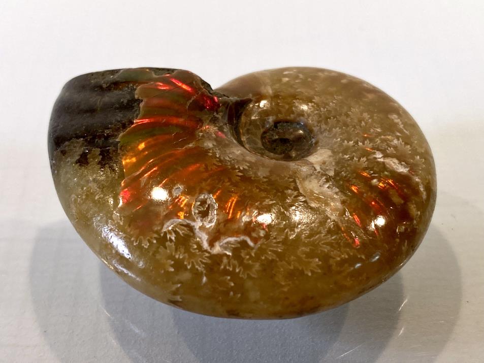 As you move an iridescent ammonite in the presence of light, one can observe the colours moving, changing, and flashing in what is known as chromatic shift.