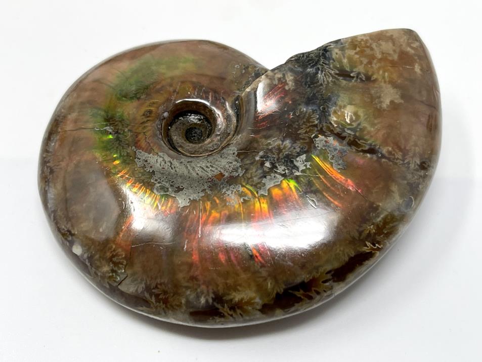 As you move an iridescent ammonite in the presence of light, one can observe the colours moving, changing, and flashing in what is known as chromatic shift.