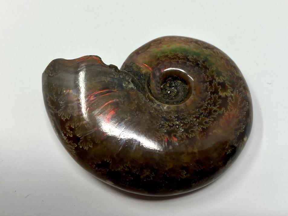 As you move an iridescent ammonite in the presence of light, one can observe the colours moving, changing, and flashing in what is known as chromatic shift.