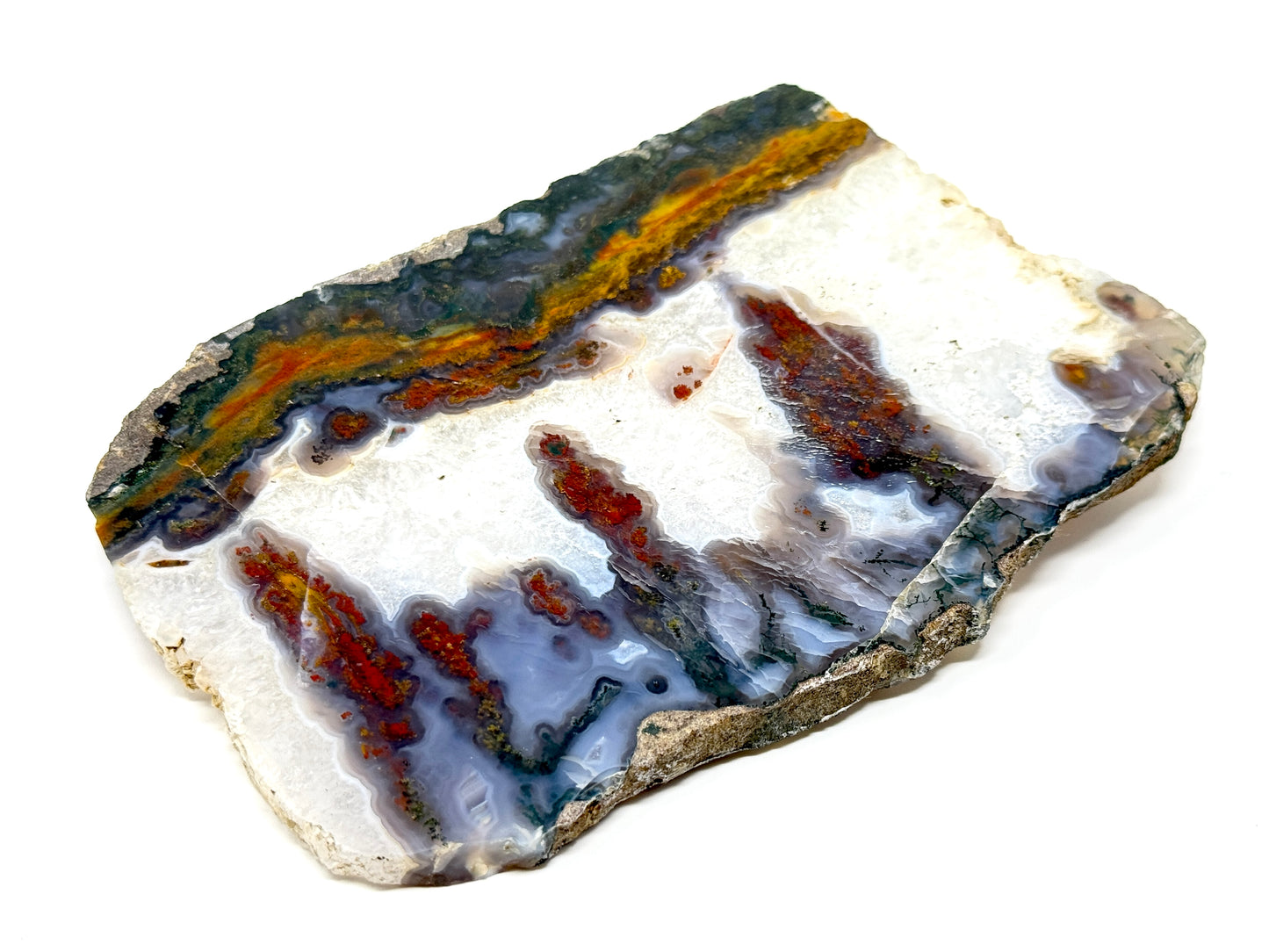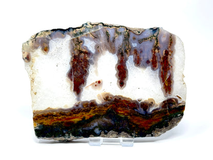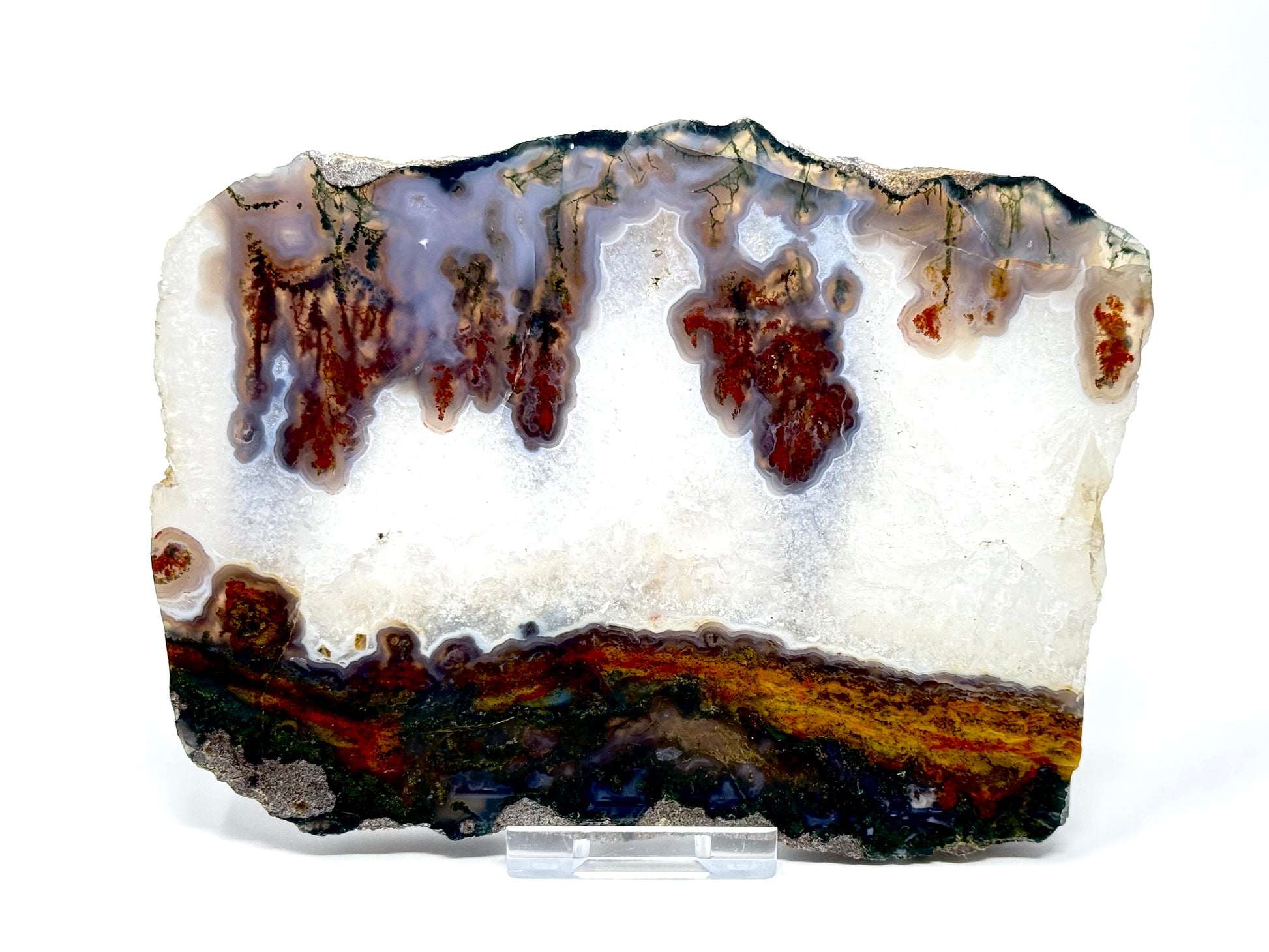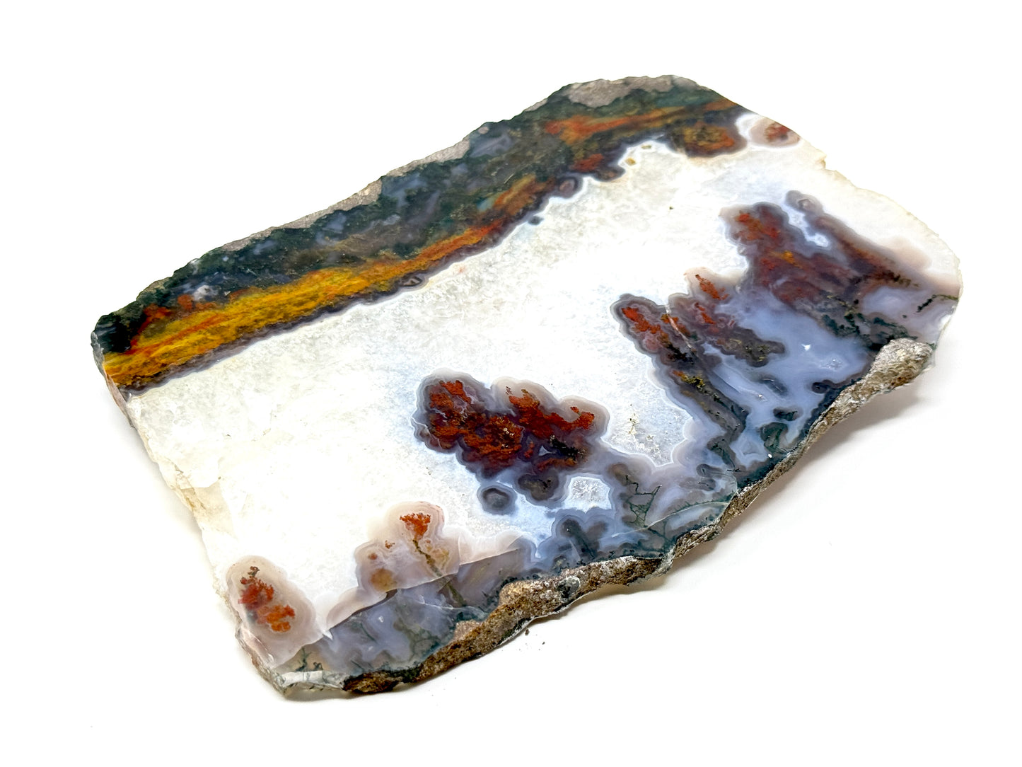 This Moss Agate Slice showcases stunning milky White Quartz/ White Agate and gorgeous translucent Blue-Grey Agate/ Blue-Grey Chalcedony adorned with dark and verdant green tree-like, moss-like dendritic patterns.