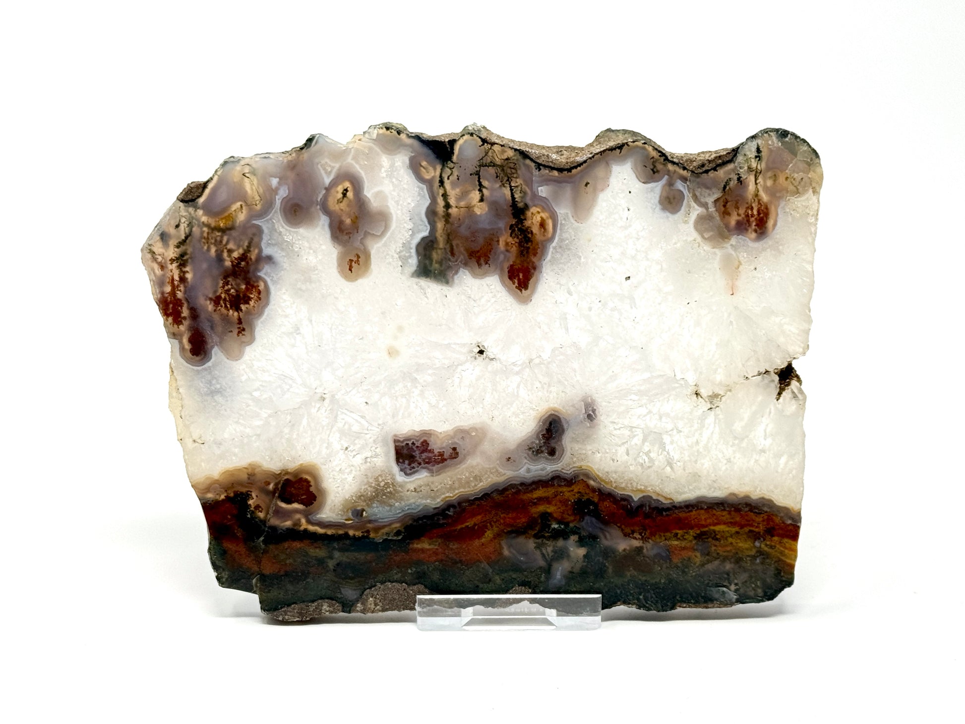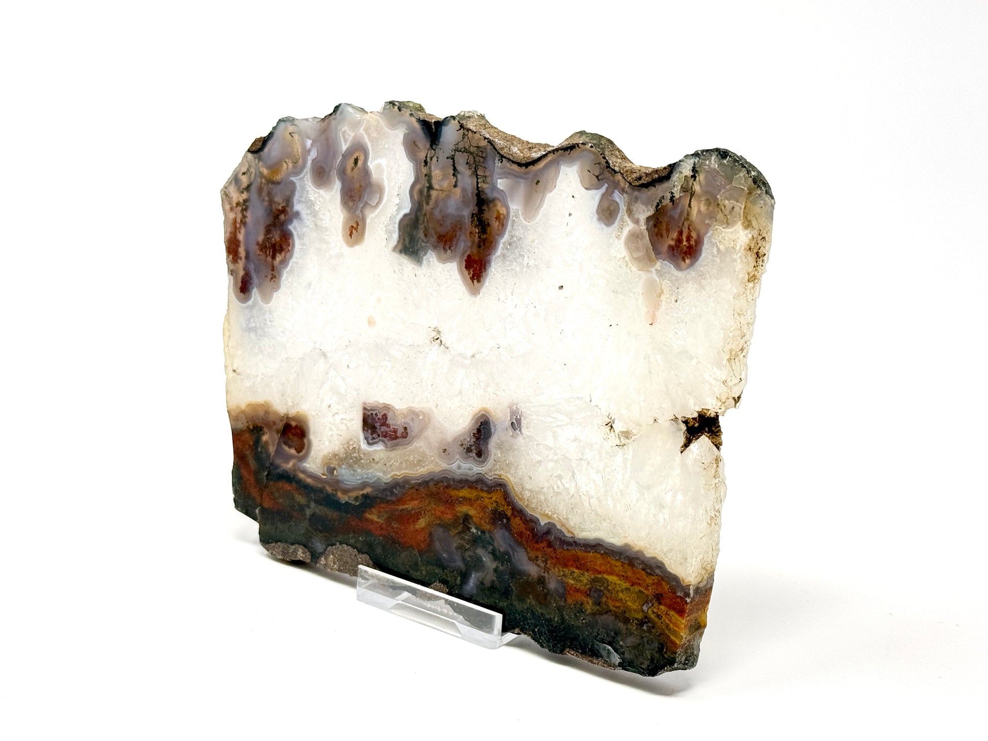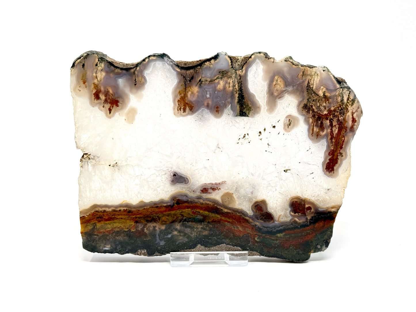 This Moss Agate Slice showcases stunning milky White Quartz/ White Agate and gorgeous translucent Blue-Grey Agate/ Blue-Grey Chalcedony adorned with dark and verdant green tree-like, moss-like dendritic patterns.
