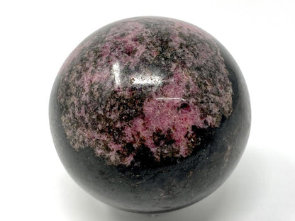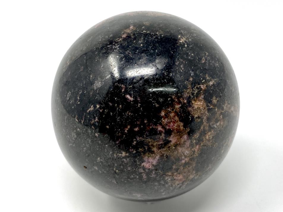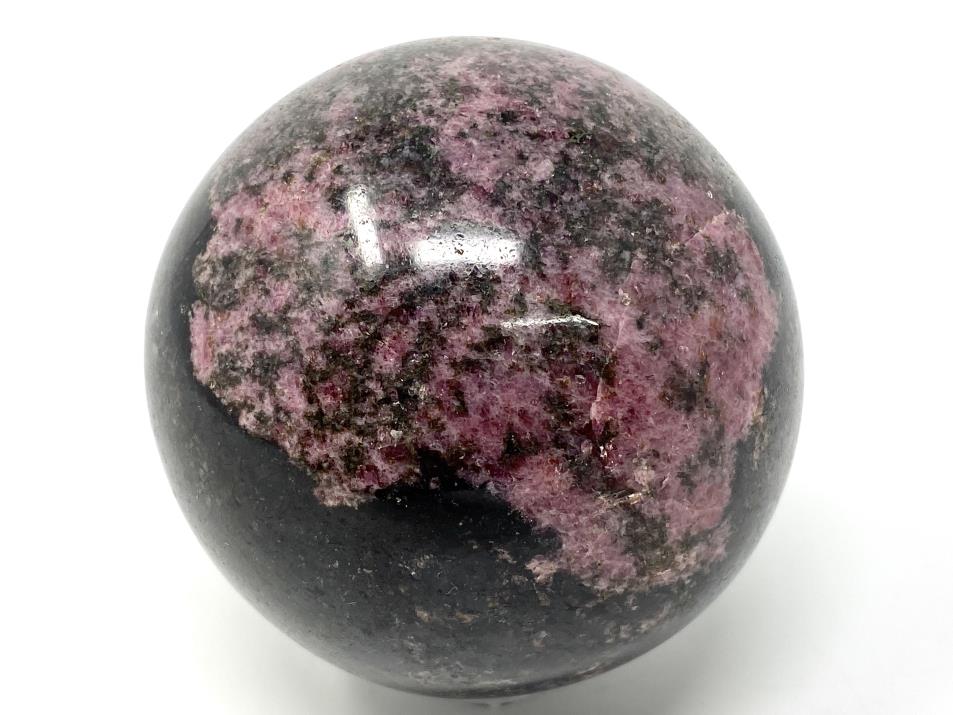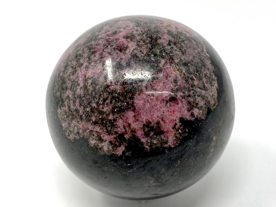 This stunning polished Rhodonite Crystal Sphere measures 6.7cm in diameter, and demonstrates a rich pink hue contrasted against vivid veins of Black Manganese.