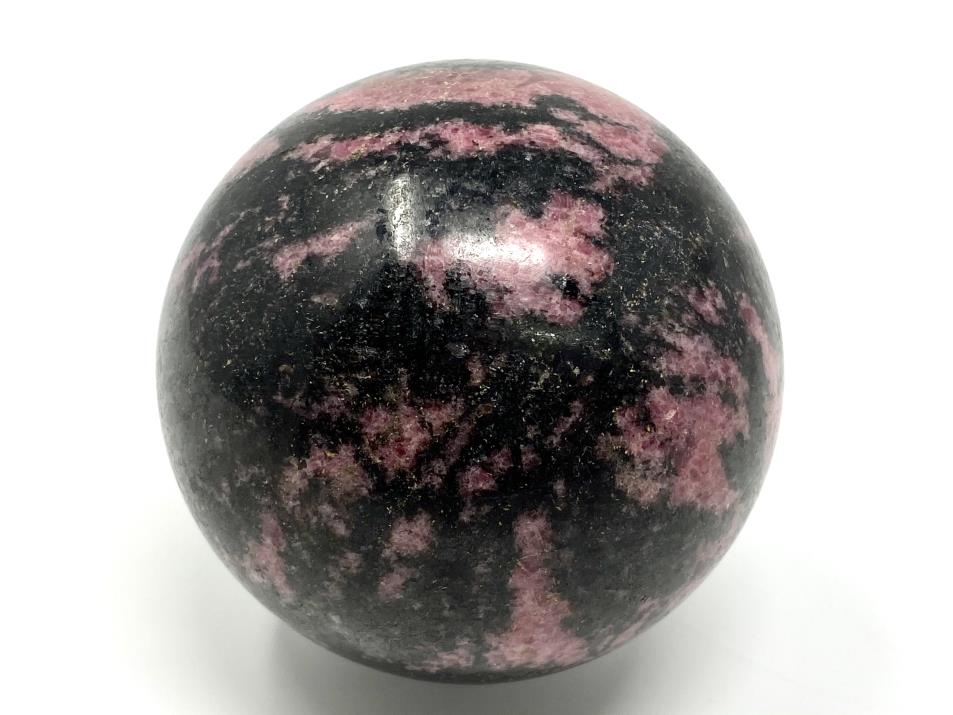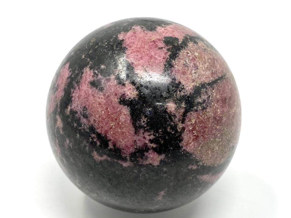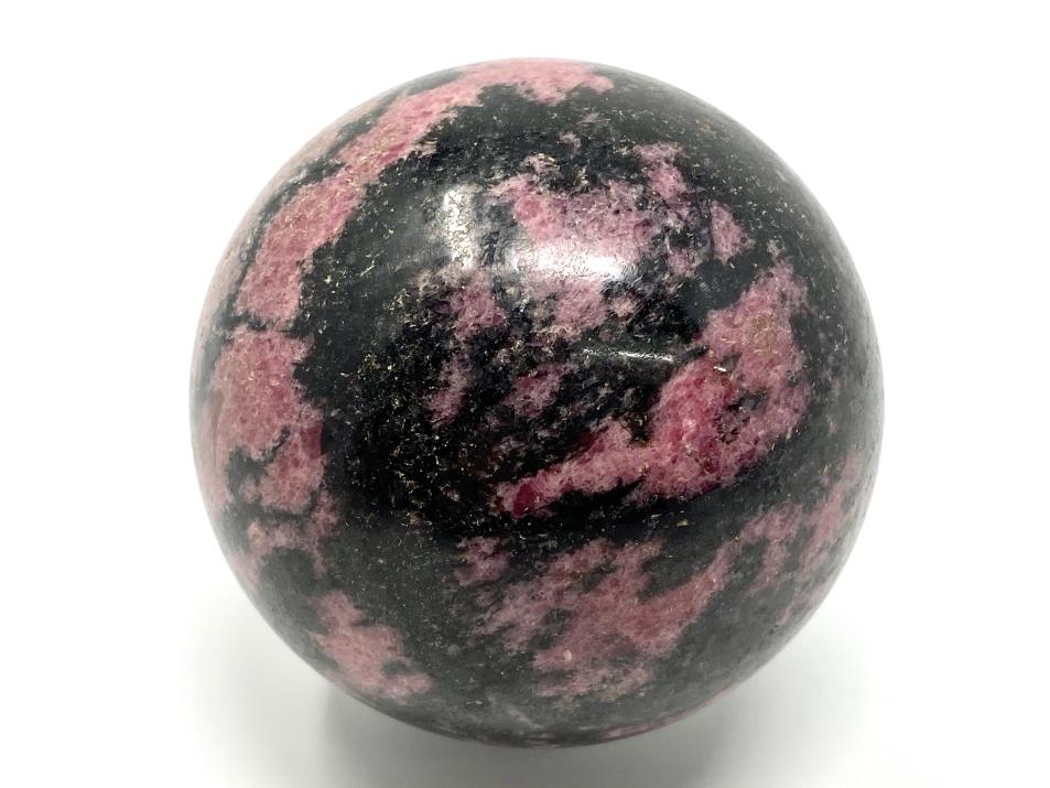 This stunning polished Large Rhodonite Crystal Sphere measures 7.8cm in diameter, and demonstrates a rich pink hue contrasted against vivid veins of Black Manganese.