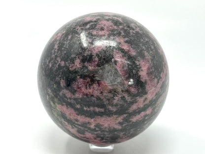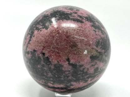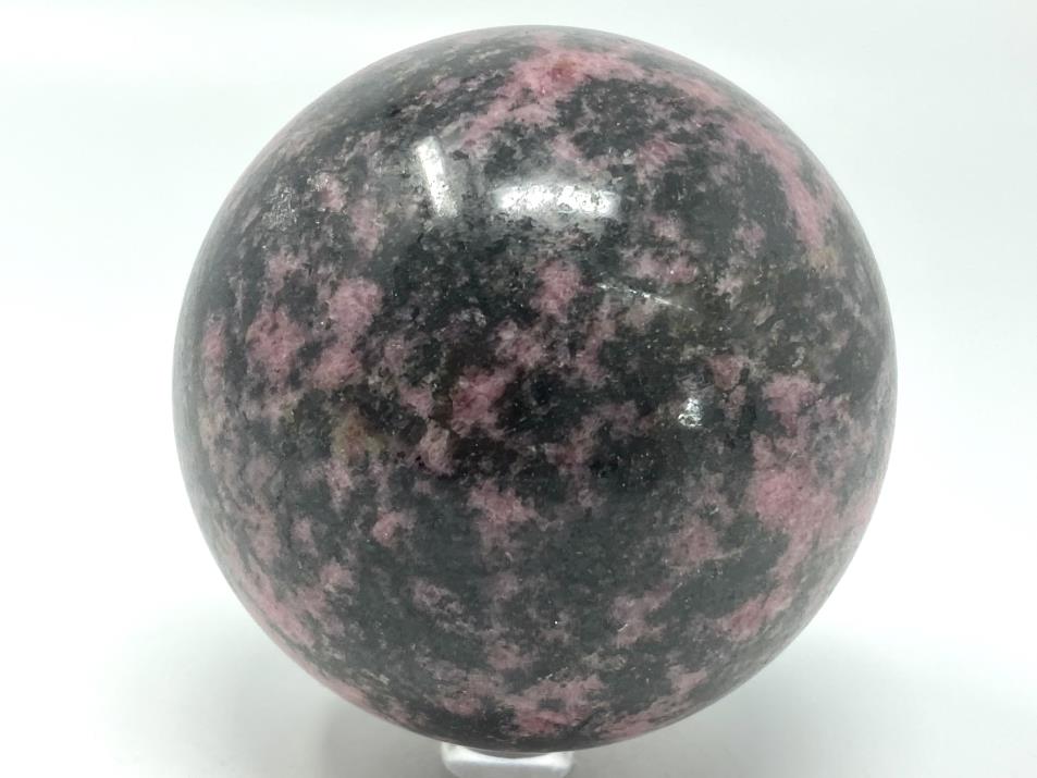 This stunning polished Large Rhodonite Crystal Sphere measures 7.8cm in diameter, and demonstrates a rich pink hue contrasted against vivid veins of Black Manganese.