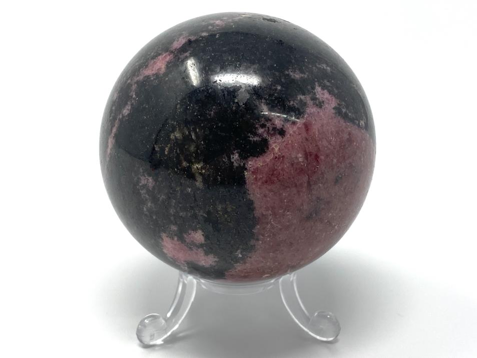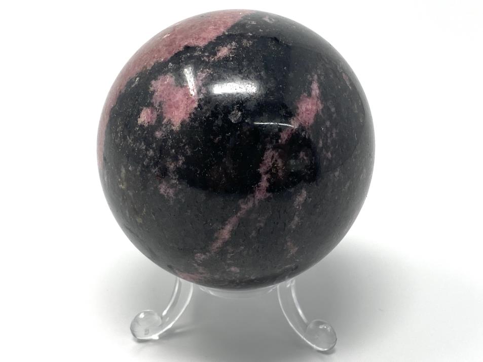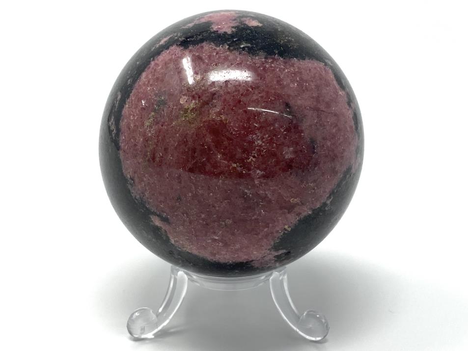 This stunning polished Large Rhodonite Crystal Sphere measures 7cm in diameter, and demonstrates a rich pink hue contrasted against vivid veins of Black Manganese.