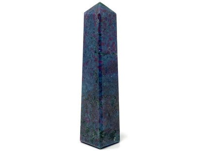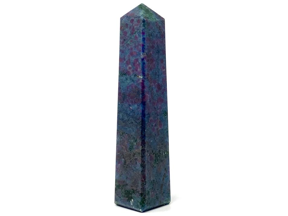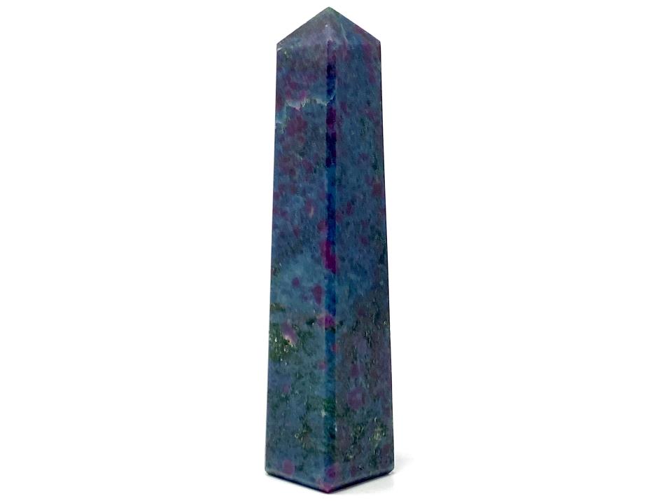 This striking Ruby in Kyanite Tower Crystal (otherwise known as a Ruby in Kyanite Obelisk Crystal) measuring 10.7cm tall displays stunning deep blue Kyanite speckled with bright red Ruby inclusions.
