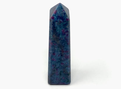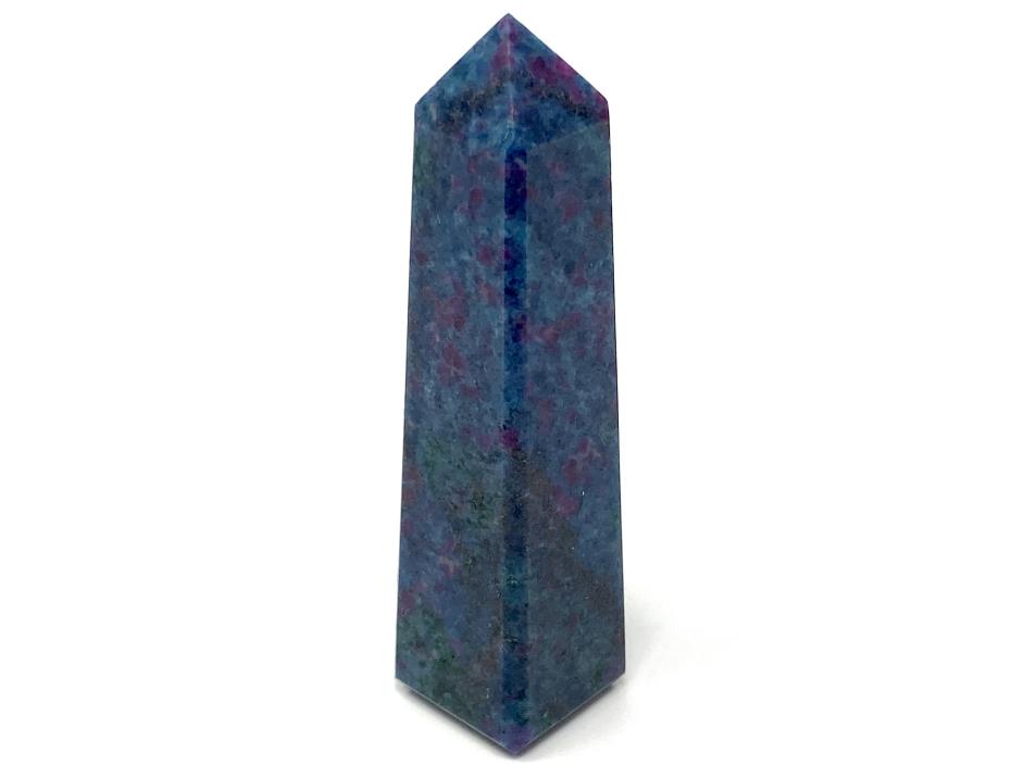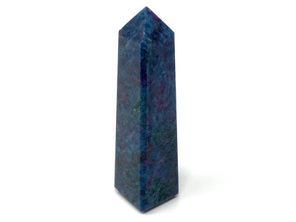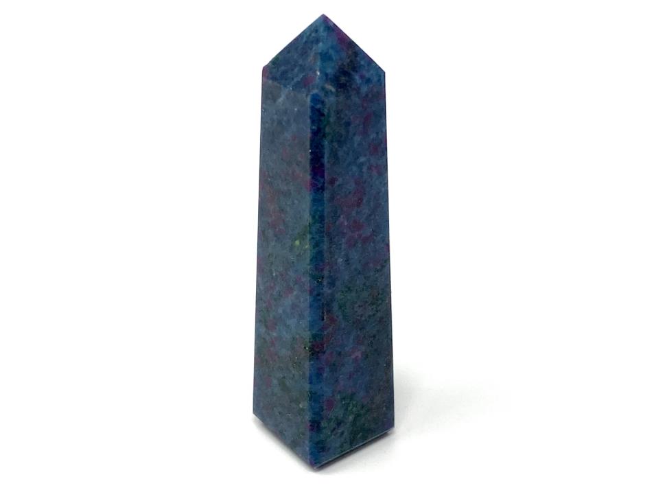 This striking Ruby in Kyanite Tower Crystal (otherwise known as a Ruby in Kyanite Obelisk Crystal) measuring 8.4cm tall displays stunning deep blue Kyanite speckled with bright red Ruby inclusions.
