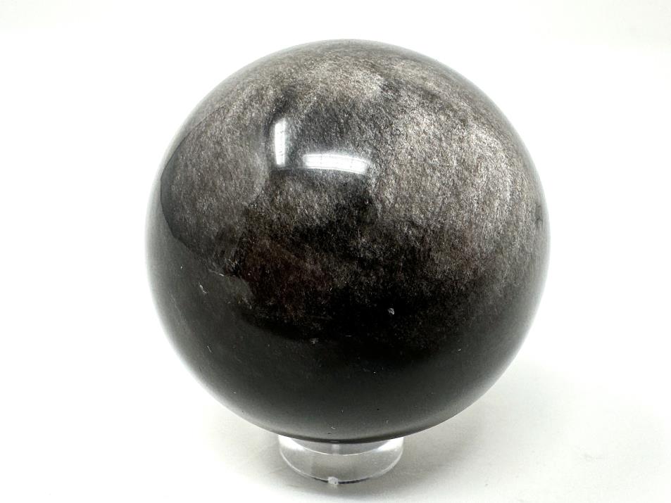 This gorgeous Silver Sheen Obsidian Sphere measuring 4.5cm in diameter displays a striking jet-black Black Obsidian base that lights up with a shimmering, silver sheen reminiscent of moonlight.