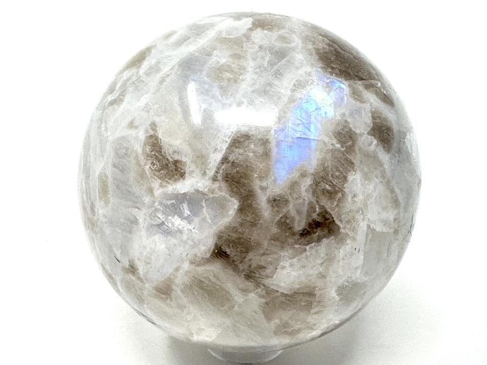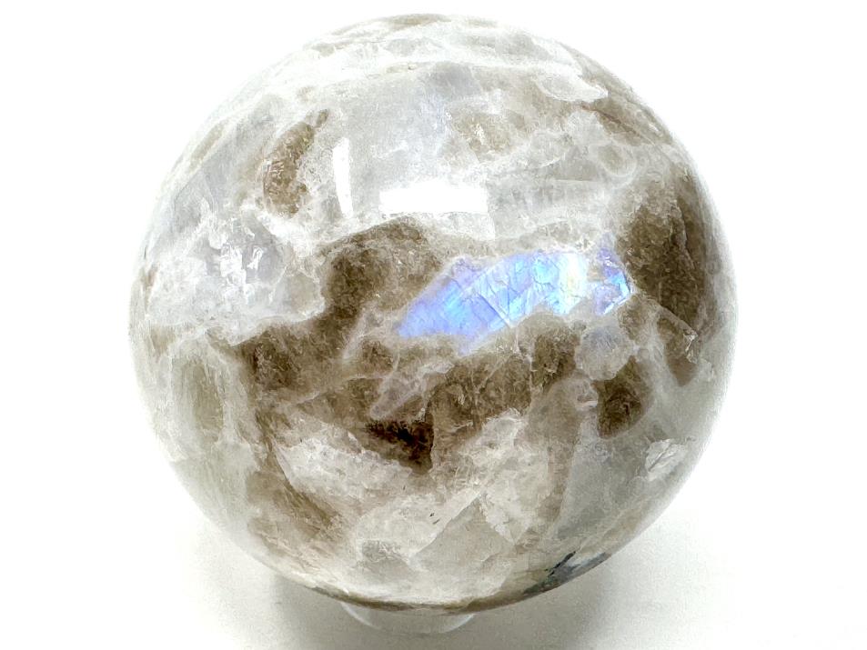 This gorgeous Rainbow Moonstone Crystal Sphere (otherwise known as a Rainbow Moonstone Sphere or Rainbow Moonstone Crystal Ball) measuring 5.4cm in diameter displays a creamy white translucence and flashes of glowing bright blue.