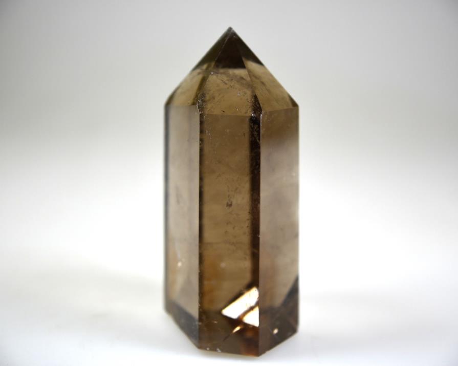Smoky Quartz Point, crystal for sale from Brazil. This wonderful Smoky Quartz point is very bright, clear and stands 7.7cm tall. The Quartz is vibrant and very tactile it has been cut and then highly polished from a large block of high quality crystal. The size, clarity and quality of this point is wonderful and would make a stunning display piece in any home or would be ideal for the collector or healer.