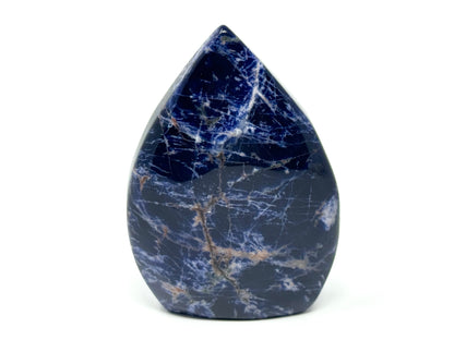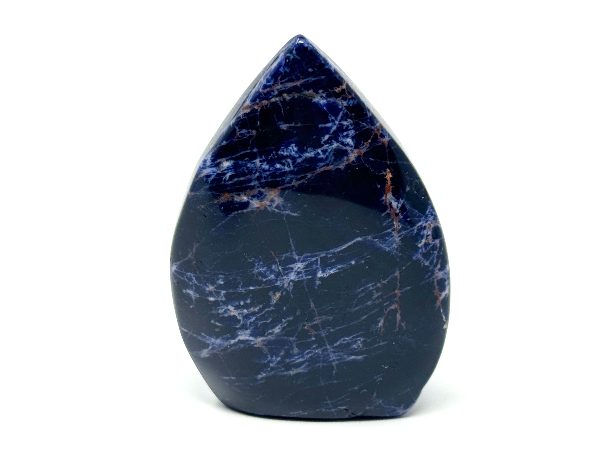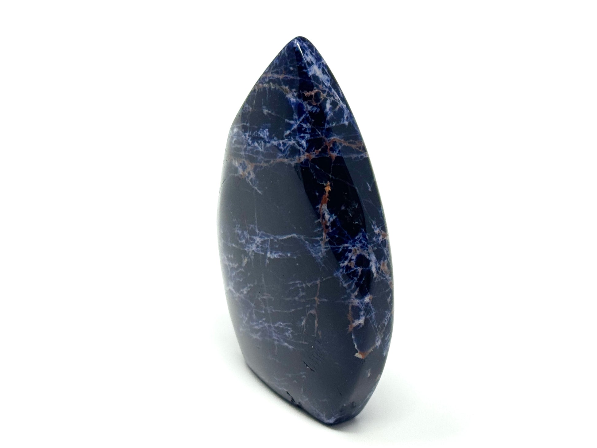 This gorgeous Sodalite Crystal Freeform measuring 8cm tall displays a free-standing base and a deep royal-blue hue contrasted against streaks of White Calcite, with some striking orange-brown and shimmering metallic Hematite inclusions.
