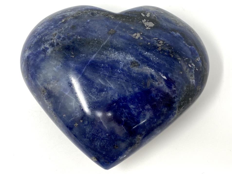 This gorgeous Sodalite Crystal Heart measuring 7.2cm wide displays a deep royal-blue hue contrasted against streaks of White Calcite, with striking orange-brown and shimmering metallic Hematite inclusions.