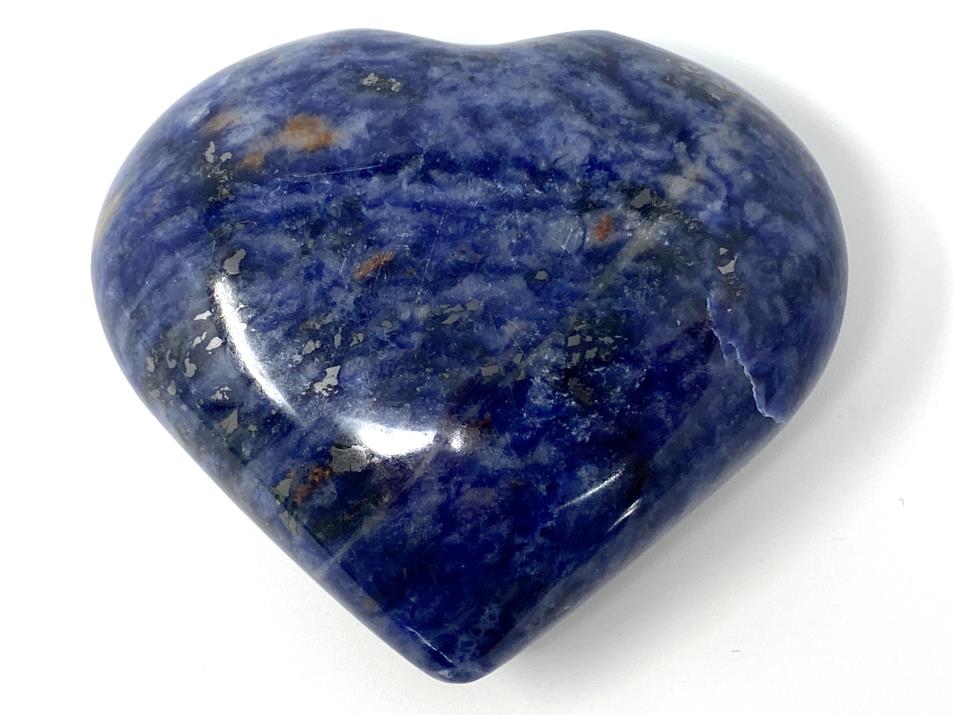 This gorgeous Sodalite Crystal Heart measuring 7.1cm wide displays a deep royal-blue hue contrasted against streaks of White Calcite, with striking orange-brown and shimmering metallic Hematite inclusions.